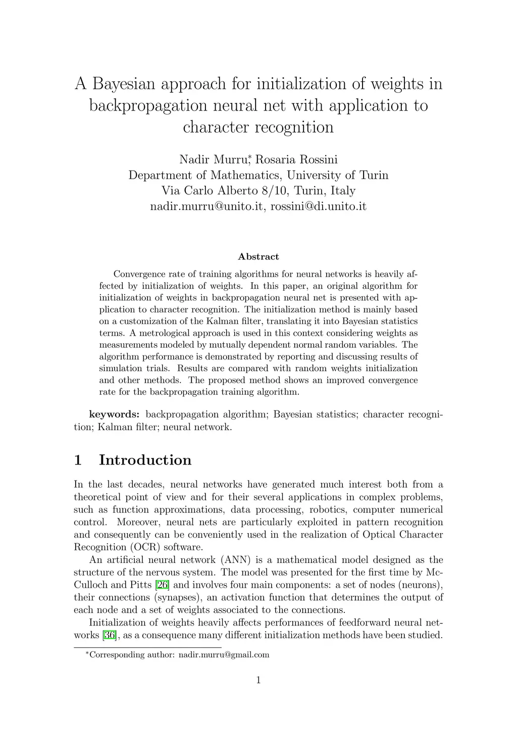 Convergence rate of training algorithms for neural networks is heavily affected by initialization of weights. In this paper, an original algorithm for initialization of weights in backpropagation neural net is presented with application to character recognition. The initialization method is mainly based on a customization of the Kalman filter, translating it into Bayesian statistics terms. A metrological approach is used in this context considering weights as measurements modeled by mutually dependent normal random variables. The algorithm performance is demonstrated by reporting and discussing results of simulation trials. Results are compared with random weights initialization and other methods. The proposed method shows an improved convergence rate for the backpropagation training algorithm.
