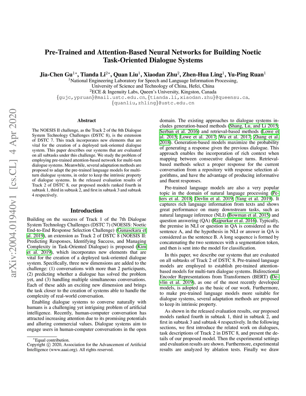The NOESIS II challenge, as the Track 2 of the 8th Dialogue System Technology Challenges (DSTC 8), is the extension of DSTC 7. This track incorporates new elements that are vital for the creation of a deployed task-oriented dialogue system. This paper describes our systems that are evaluated on all subtasks under this challenge. We study the problem of employing pre-trained attention-based network for multi-turn dialogue systems. Meanwhile, several adaptation methods are proposed to adapt the pre-trained language models for multi-turn dialogue systems, in order to keep the intrinsic property of dialogue systems. In the released evaluation results of Track 2 of DSTC 8, our proposed models ranked fourth in subtask 1, third in subtask 2, and first in subtask 3 and subtask 4 respectively.