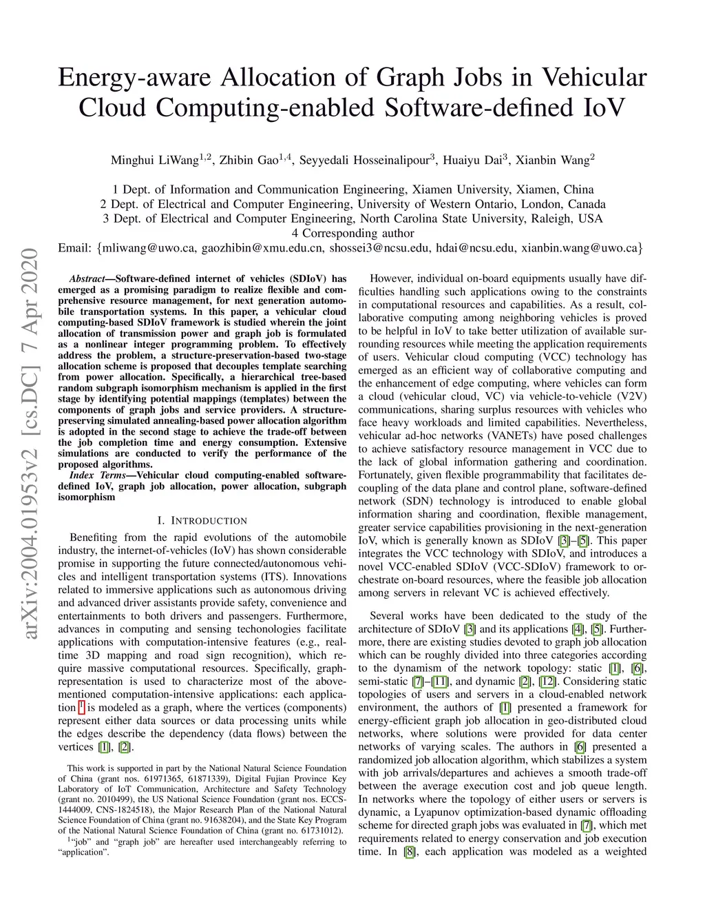 Software-defined internet of vehicles (SDIoV) has emerged as a promising paradigm to realize flexible and comprehensive resource management, for next generation automobile transportation systems. In this paper, a vehicular cloud computing-based SDIoV framework is studied wherein the joint allocation of transmission power and graph job is formulated as a nonlinear integer programming problem. To effectively address the problem, a structure-preservation-based two-stage allocation scheme is proposed that decouples template searching from power allocation. Specifically, a hierarchical tree-based random subgraph isomorphism mechanism is applied in the first stage by identifying potential mappings (templates) between the components of graph jobs and service providers. A structure-preserving simulated annealing-based power allocation algorithm is adopted in the second stage to achieve the trade-off between the job completion time and energy consumption. Extensive simulations are conducted to verify the performance of the proposed algorithms.