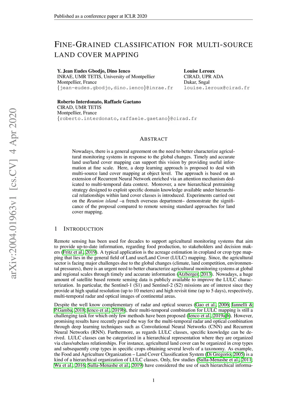 Nowadays, there is a general agreement on the need to better characterize agricultural monitoring systems in response to the global changes. Timely and accurate land use/land cover mapping can support this vision by providing useful information at fine scale. Here, a deep learning approach is proposed to deal with multi-source land cover mapping at object level. The approach is based on an extension of Recurrent Neural Network enriched via an attention mechanism dedicated to multi-temporal data context. Moreover, a new hierarchical pretraining strategy designed to exploit specific domain knowledge available under hierarchical relationships within land cover classes is introduced. Experiments carried out on the Reunion island - a french overseas department - demonstrate the significance of the proposal compared to remote sensing standard approaches for land cover mapping.