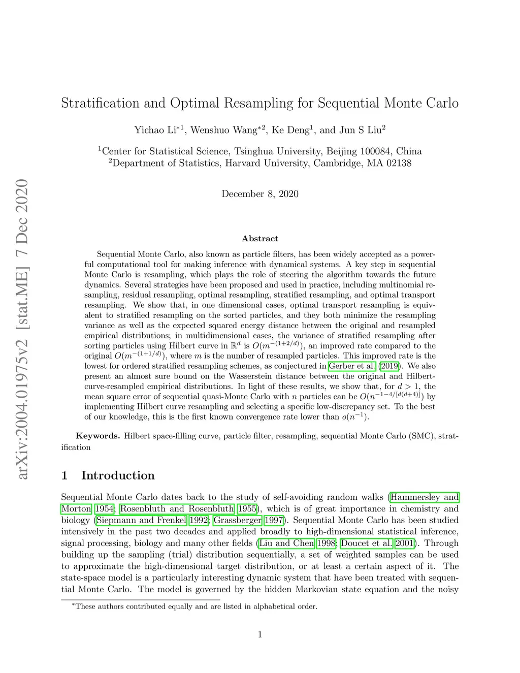 Sequential Monte Carlo (SMC), also known as particle filters, has been widely accepted as a powerful computational tool for making inference with dynamical systems. A key step in SMC is resampling, which plays the role of steering the algorithm towards the future dynamics. Several strategies have been proposed and used in practice, including multinomial resampling, residual resampling (Liu and Chen 1998), optimal resampling (Fearnhead and Clifford 2003), stratified resampling (Kitagawa 1996), and optimal transport resampling (Reich 2013). We show that, in the one dimensional case, optimal transport resampling is equivalent to stratified resampling on the sorted particles, and they both minimize the resampling variance as well as the expected squared energy distance between the original and resampled empirical distributions; in the multidimensional case, the variance of stratified resampling after sorting particles using Hilbert curve (Gerber et al. 2019) in is , an improved rate compared to the original , where is the number of resampled particles. This improved rate is the lowest for ordered stratified resampling schemes, as conjectured in Gerber et al. (2019). We also present an almost sure bound on the Wasserstein distance between the original and Hilbert-curve-resampled empirical distributions. In light of these theoretical results, we propose the stratified multiple-descendant growth (SMG) algorithm, which allows us to explore the sample space more efficiently compared to the standard i.i.d. multiple-descendant sampling-resampling approach as measured by the Wasserstein metric. Numerical evidence is provided to demonstrate the effectiveness of our proposed method.