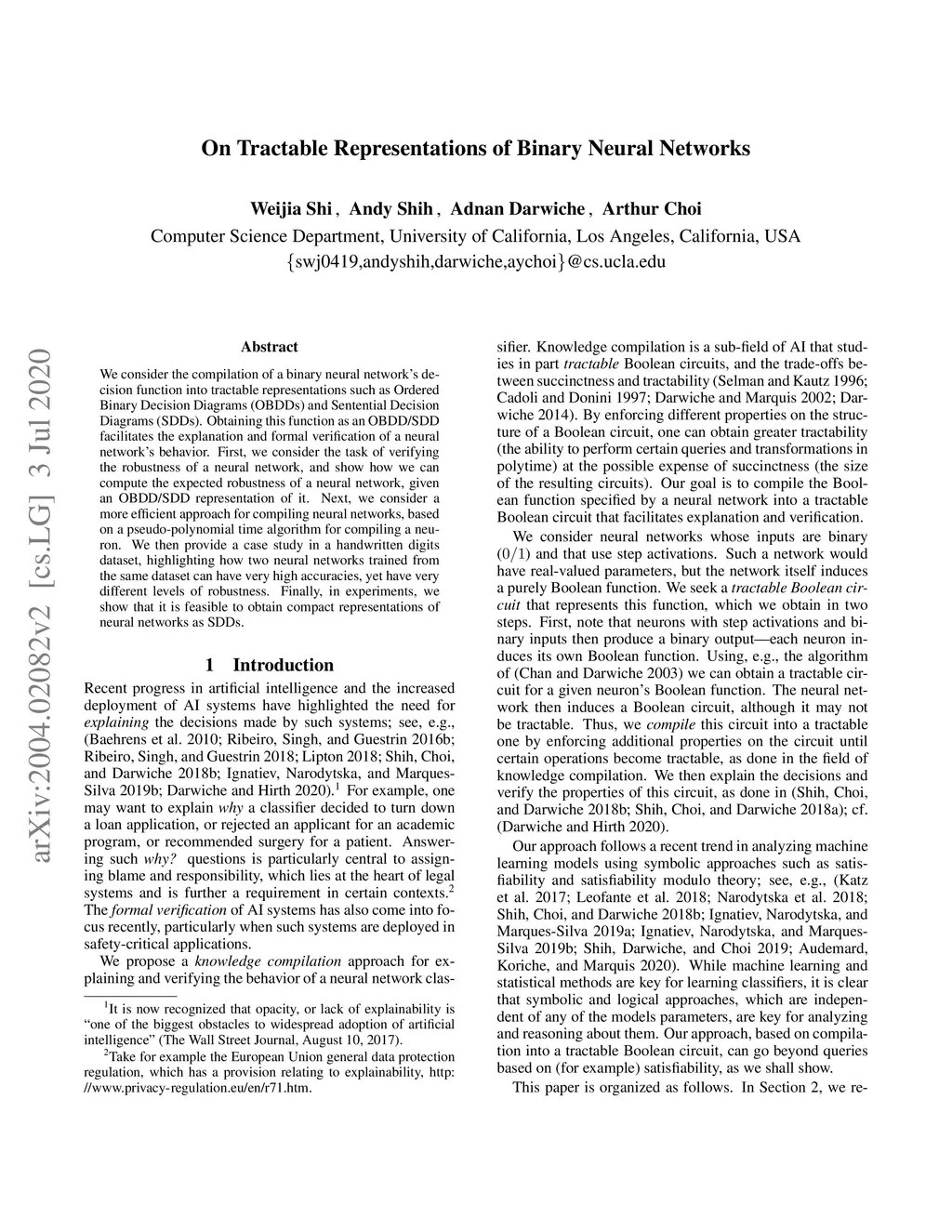 We consider the compilation of a binary neural network's decision function into tractable representations such as Ordered Binary Decision Diagrams (OBDDs) and Sentential Decision Diagrams (SDDs). Obtaining this function as an OBDD/SDD facilitates the explanation and formal verification of a neural network's behavior. First, we consider the task of verifying the robustness of a neural network, and show how we can compute the expected robustness of a neural network, given an OBDD/SDD representation of it. Next, we consider a more efficient approach for compiling neural networks, based on a pseudo-polynomial time algorithm for compiling a neuron. We then provide a case study in a handwritten digits dataset, highlighting how two neural networks trained from the same dataset can have very high accuracies, yet have very different levels of robustness. Finally, in experiments, we show that it is feasible to obtain compact representations of neural networks as SDDs.