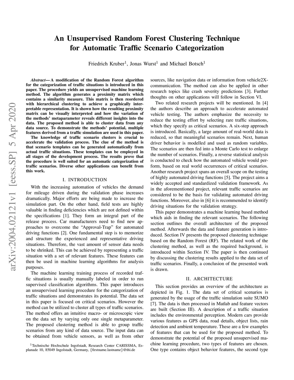 A modification of the Random Forest algorithm for the categorization of traffic situations is introduced in this paper. The procedure yields an unsupervised machine learning method. The algorithm generates a proximity matrix which contains a similarity measure. This matrix is then reordered with hierarchical clustering to achieve a graphically interpretable representation. It is shown how the resulting proximity matrix can be visually interpreted and how the variation of the methods' metaparameter reveals different insights into the data. The proposed method is able to cluster data from any data source. To demonstrate the methods' potential, multiple features derived from a traffic simulation are used in this paper. The knowledge of traffic scenario clusters is crucial to accelerate the validation process. The clue of the method is that scenario templates can be generated automatically from actual traffic situations. These templates can be employed in all stages of the development process. The results prove that the procedure is well suited for an automatic categorization of traffic scenarios. Diverse other applications can benefit from this work.
