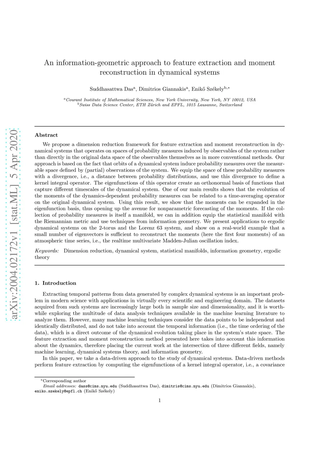We propose a dimension reduction framework for feature extraction and moment reconstruction in dynamical systems that operates on spaces of probability measures induced by observables of the system rather than directly in the original data space of the observables themselves as in more conventional methods. Our approach is based on the fact that orbits of a dynamical system induce probability measures over the measurable space defined by (partial) observations of the system. We equip the space of these probability measures with a divergence, i.e., a distance between probability distributions, and use this divergence to define a kernel integral operator. The eigenfunctions of this operator create an orthonormal basis of functions that capture different timescales of the dynamical system. One of our main results shows that the evolution of the moments of the dynamics-dependent probability measures can be related to a time-averaging operator on the original dynamical system. Using this result, we show that the moments can be expanded in the eigenfunction basis, thus opening up the avenue for nonparametric forecasting of the moments. If the collection of probability measures is itself a manifold, we can in addition equip the statistical manifold with the Riemannian metric and use techniques from information geometry. We present applications to ergodic dynamical systems on the 2-torus and the Lorenz 63 system, and show on a real-world example that a small number of eigenvectors is sufficient to reconstruct the moments (here the first four moments) of an atmospheric time series, i.e., the realtime multivariate Madden-Julian oscillation index.