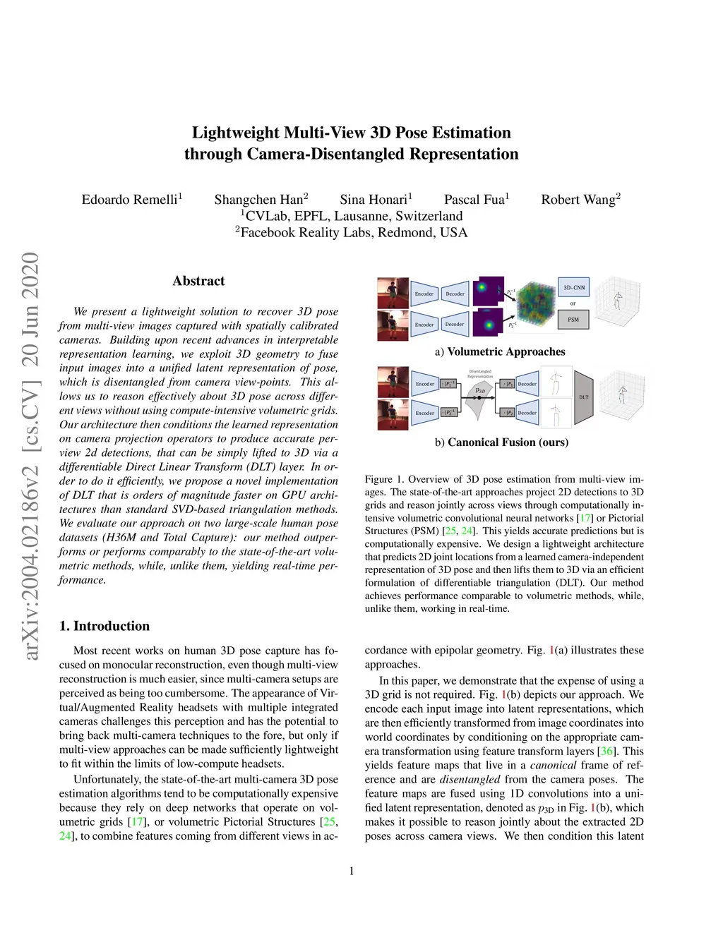 We present a lightweight solution to recover 3D pose from multi-view images captured with spatially calibrated cameras. Building upon recent advances in interpretable representation learning, we exploit 3D geometry to fuse input images into a unified latent representation of pose, which is disentangled from camera view-points. This allows us to reason effectively about 3D pose across different views without using compute-intensive volumetric grids. Our architecture then conditions the learned representation on camera projection operators to produce accurate per-view 2d detections, that can be simply lifted to 3D via a differentiable Direct Linear Transform (DLT) layer. In order to do it efficiently, we propose a novel implementation of DLT that is orders of magnitude faster on GPU architectures than standard SVD-based triangulation methods. We evaluate our approach on two large-scale human pose datasets (H36M and Total Capture): our method outperforms or performs comparably to the state-of-the-art volumetric methods, while, unlike them, yielding real-time performance.