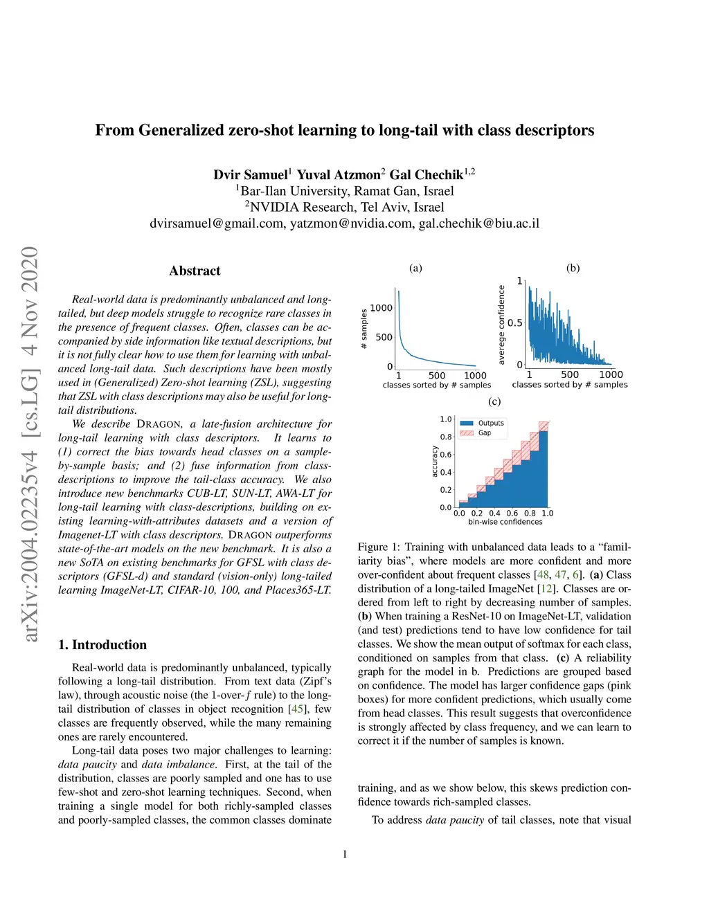 Real-world data is predominantly unbalanced and long-tailed, but deep models struggle to recognize rare classes in the presence of frequent classes. Often, classes can be accompanied by side information like textual descriptions, but it is not fully clear how to use them for learning with unbalanced long-tail data. Such descriptions have been mostly used in (Generalized) Zero-shot learning (ZSL), suggesting that ZSL with class descriptions may also be useful for long-tail distributions. We describe DRAGON, a late-fusion architecture for long-tail learning with class descriptors. It learns to (1) correct the bias towards head classes on a sample-by-sample basis; and (2) fuse information from class-descriptions to improve the tail-class accuracy. We also introduce new benchmarks CUB-LT, SUN-LT, AWA-LT for long-tail learning with class-descriptions, building on existing learning-with-attributes datasets and a version of Imagenet-LT with class descriptors. DRAGON outperforms state-of-the-art models on the new benchmark. It is also a new SoTA on existing benchmarks for GFSL with class descriptors (GFSL-d) and standard (vision-only) long-tailed learning ImageNet-LT, CIFAR-10, 100, and Places365.