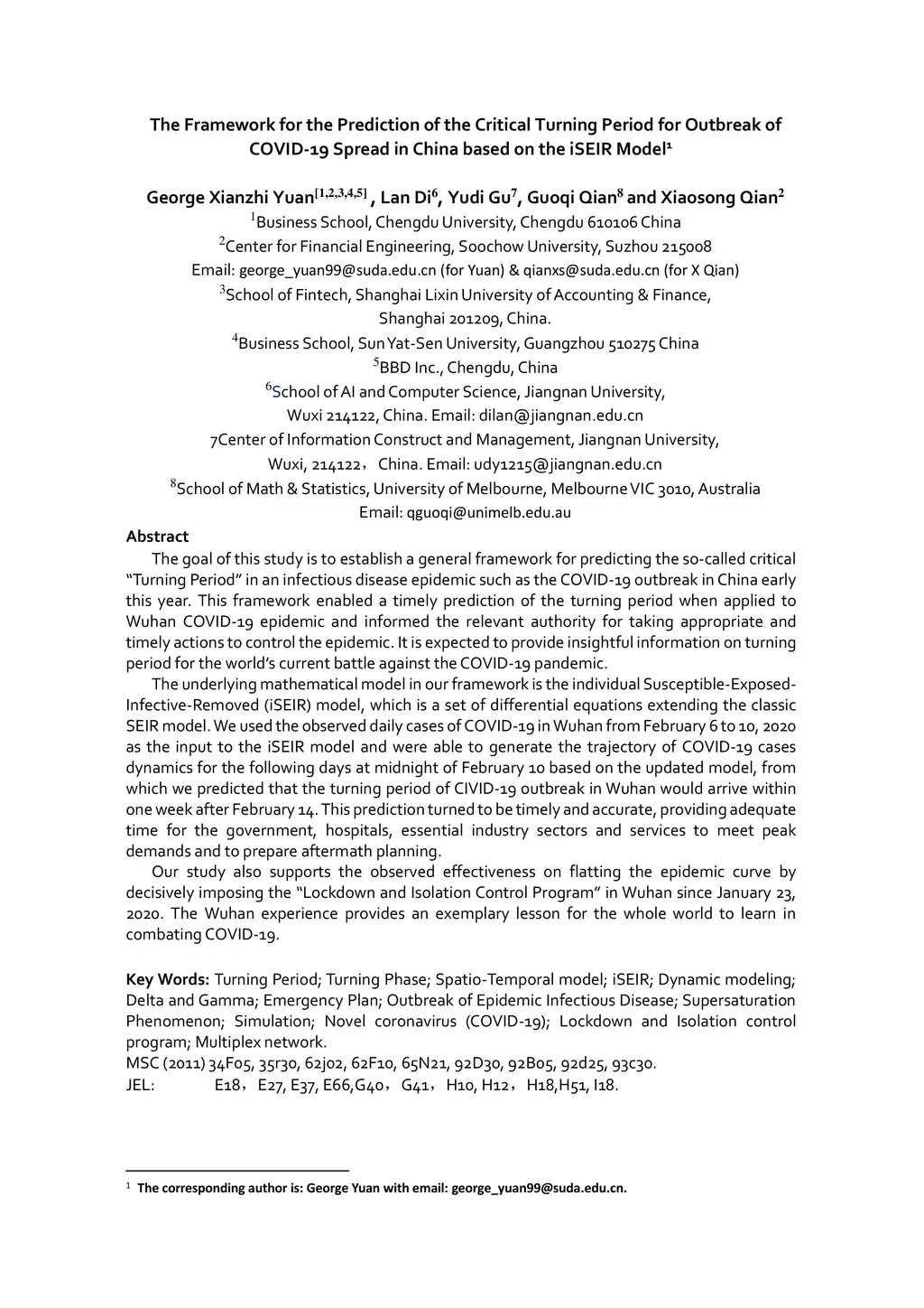 The goal of this study is to establish a general framework for predicting the so-called critical Turning Period in an infectious disease epidemic such as the COVID-19 outbreak in China early this year. This framework enabled a timely prediction of the turning period when applied to Wuhan COVID-19 epidemic and informed the relevant authority for taking appropriate and timely actions to control the epidemic. It is expected to provide insightful information on turning period for the world's current battle against the COVID-19 pandemic. The underlying mathematical model in our framework is the individual Susceptible-Exposed- Infective-Removed (iSEIR) model, which is a set of differential equations extending the classic SEIR model. We used the observed daily cases of COVID-19 in Wuhan from February 6 to 10, 2020 as the input to the iSEIR model and were able to generate the trajectory of COVID-19 cases dynamics for the following days at midnight of February 10 based on the updated model, from which we predicted that the turning period of CIVID-19 outbreak in Wuhan would arrive within one week after February 14. This prediction turned to be timely and accurate, providing adequate time for the government, hospitals, essential industry sectors and services to meet peak demands and to prepare aftermath planning. Our study also supports the observed effectiveness on flatting the epidemic curve by decisively imposing the Lockdown and Isolation Control Program in Wuhan since January 23, 2020. The Wuhan experience provides an exemplary lesson for the whole world to learn in combating COVID-19.