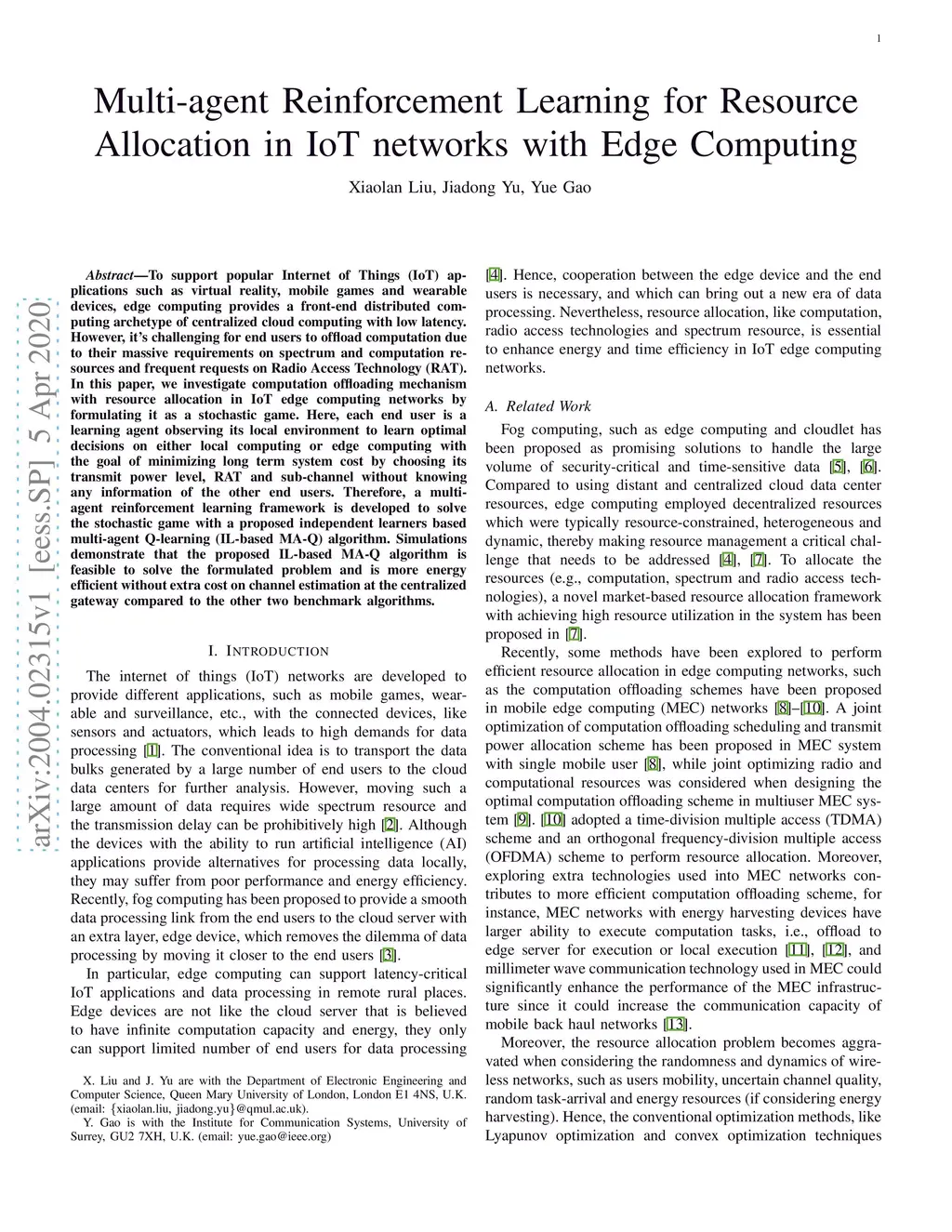 Multi-agent Reinforcement Learning for Resource Allocation in IoT