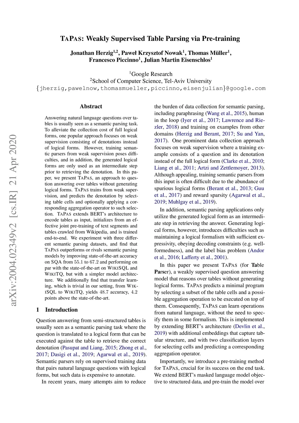 TAPAS: Weakly Supervised Table Parsing via Pre-training
