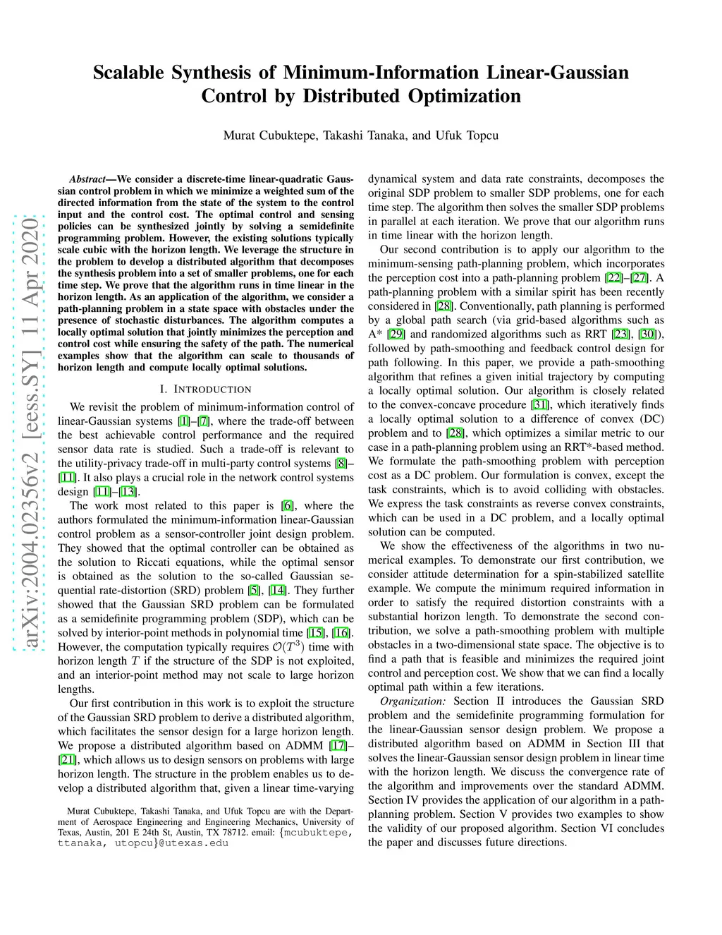 We consider a discrete-time linear-quadratic Gaussian control problem in which we minimize a weighted sum of the directed information from the state of the system to the control input and the control cost. The optimal control and sensing policies can be synthesized jointly by solving a semidefinite programming problem. However, the existing solutions typically scale cubic with the horizon length. We leverage the structure in the problem to develop a distributed algorithm that decomposes the synthesis problem into a set of smaller problems, one for each time step. We prove that the algorithm runs in time linear in the horizon length. As an application of the algorithm, we consider a path-planning problem in a state space with obstacles under the presence of stochastic disturbances. The algorithm computes a locally optimal solution that jointly minimizes the perception and control cost while ensuring the safety of the path. The numerical examples show that the algorithm can scale to thousands of horizon length and compute locally optimal solutions.