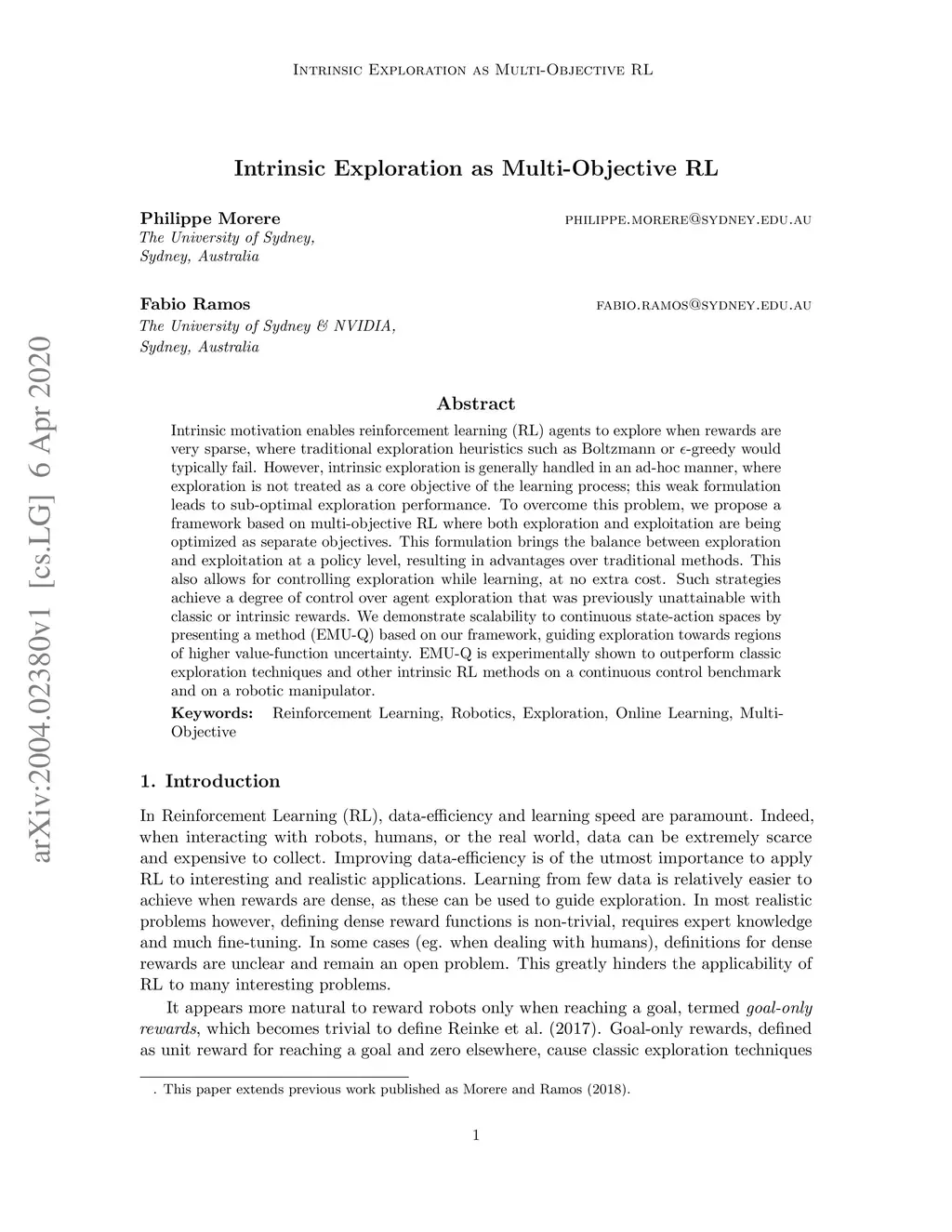Intrinsic motivation enables reinforcement learning (RL) agents to explore when rewards are very sparse, where traditional exploration heuristics such as Boltzmann or e-greedy would typically fail. However, intrinsic exploration is generally handled in an ad-hoc manner, where exploration is not treated as a core objective of the learning process; this weak formulation leads to sub-optimal exploration performance. To overcome this problem, we propose a framework based on multi-objective RL where both exploration and exploitation are being optimized as separate objectives. This formulation brings the balance between exploration and exploitation at a policy level, resulting in advantages over traditional methods. This also allows for controlling exploration while learning, at no extra cost. Such strategies achieve a degree of control over agent exploration that was previously unattainable with classic or intrinsic rewards. We demonstrate scalability to continuous state-action spaces by presenting a method (EMU-Q) based on our framework, guiding exploration towards regions of higher value-function uncertainty. EMU-Q is experimentally shown to outperform classic exploration techniques and other intrinsic RL methods on a continuous control benchmark and on a robotic manipulator.