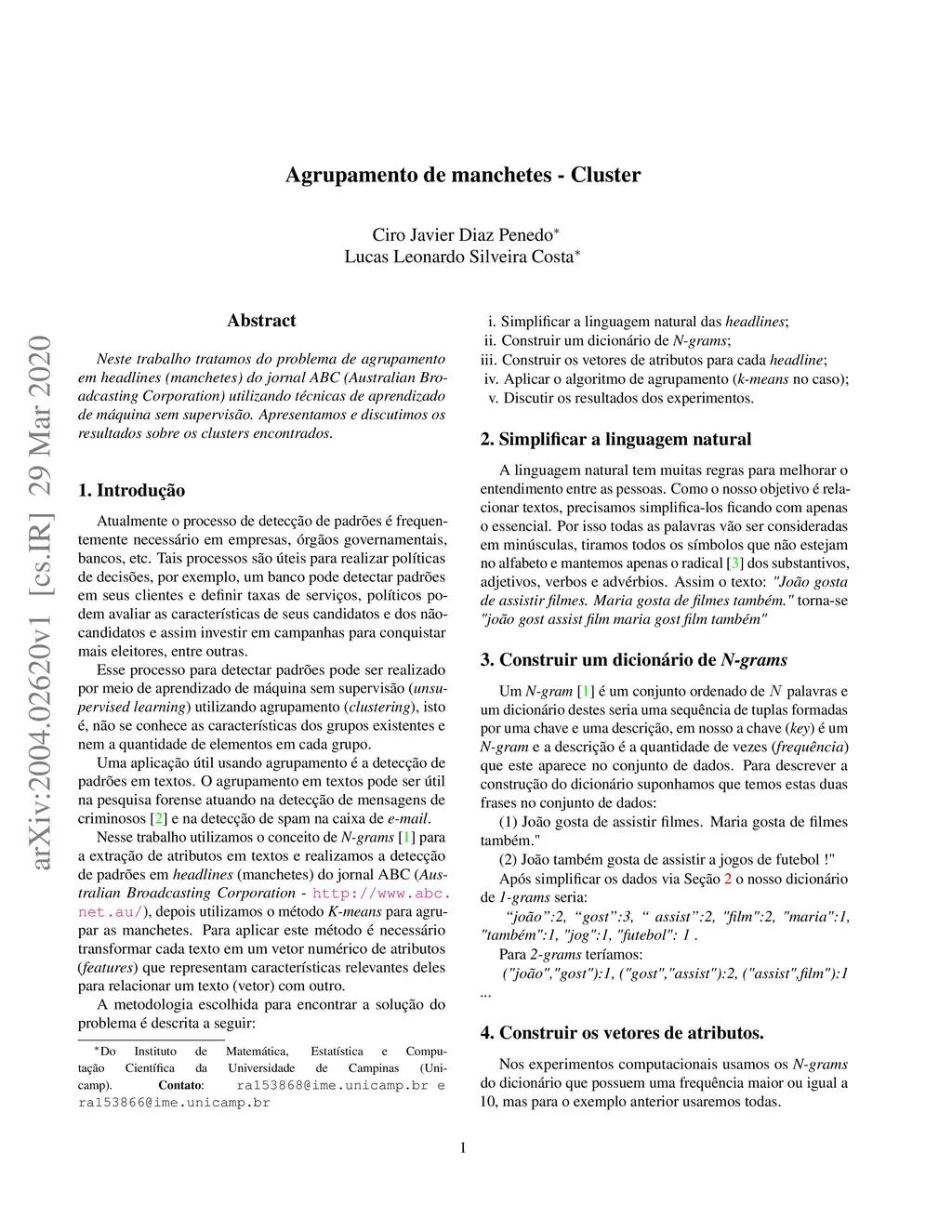 In this work we deal with the problem of grouping in headlines of the newspaper ABC (Australian Bro-adcasting Corporation) using unsupervised machine learning techniques. We present and discuss the results on the clusters found
