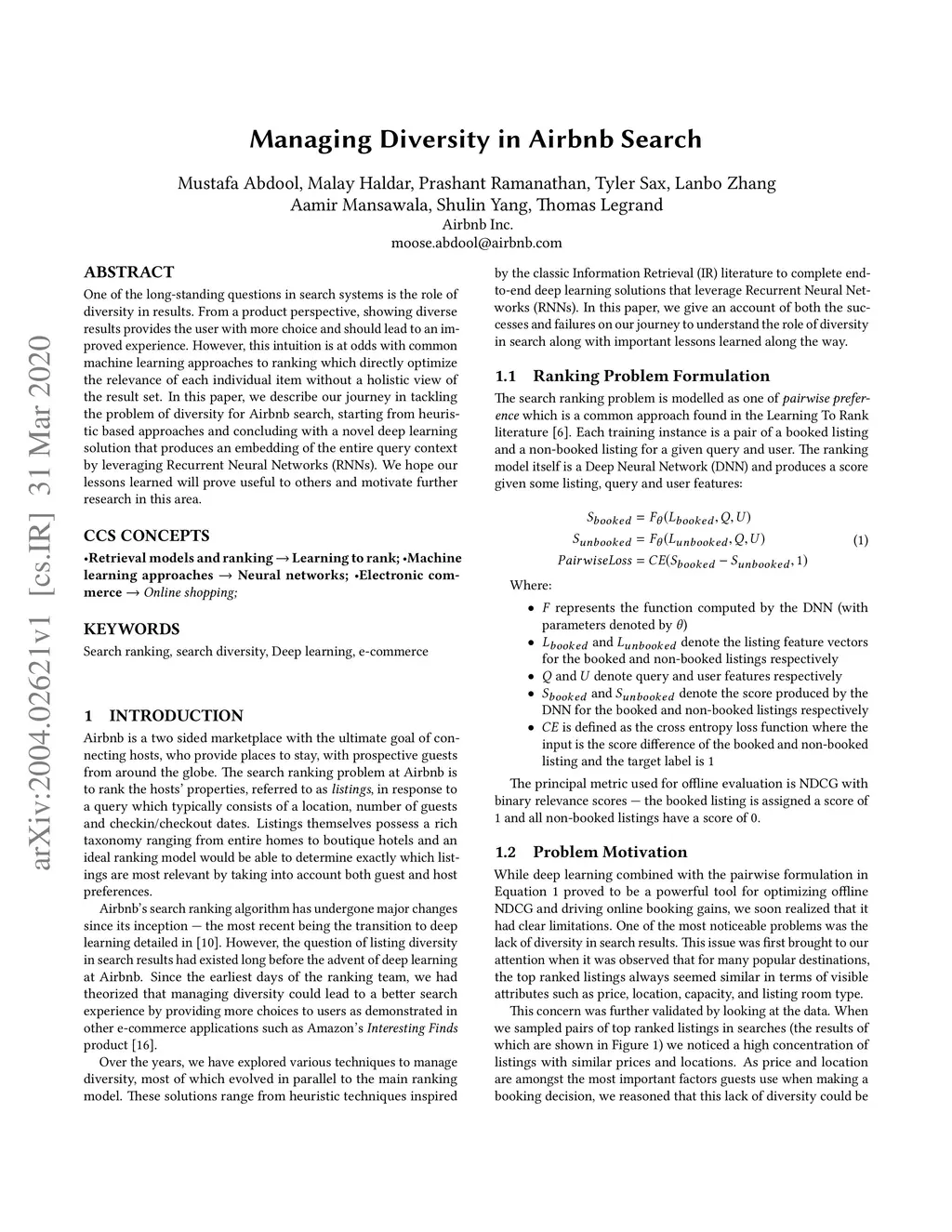 One of the long-standing questions in search systems is the role of diversity in results. From a product perspective, showing diverse results provides the user with more choice and should lead to an improved experience. However, this intuition is at odds with common machine learning approaches to ranking which directly optimize the relevance of each individual item without a holistic view of the result set. In this paper, we describe our journey in tackling the problem of diversity for Airbnb search, starting from heuristic based approaches and concluding with a novel deep learning solution that produces an embedding of the entire query context by leveraging Recurrent Neural Networks (RNNs). We hope our lessons learned will prove useful to others and motivate further research in this area.