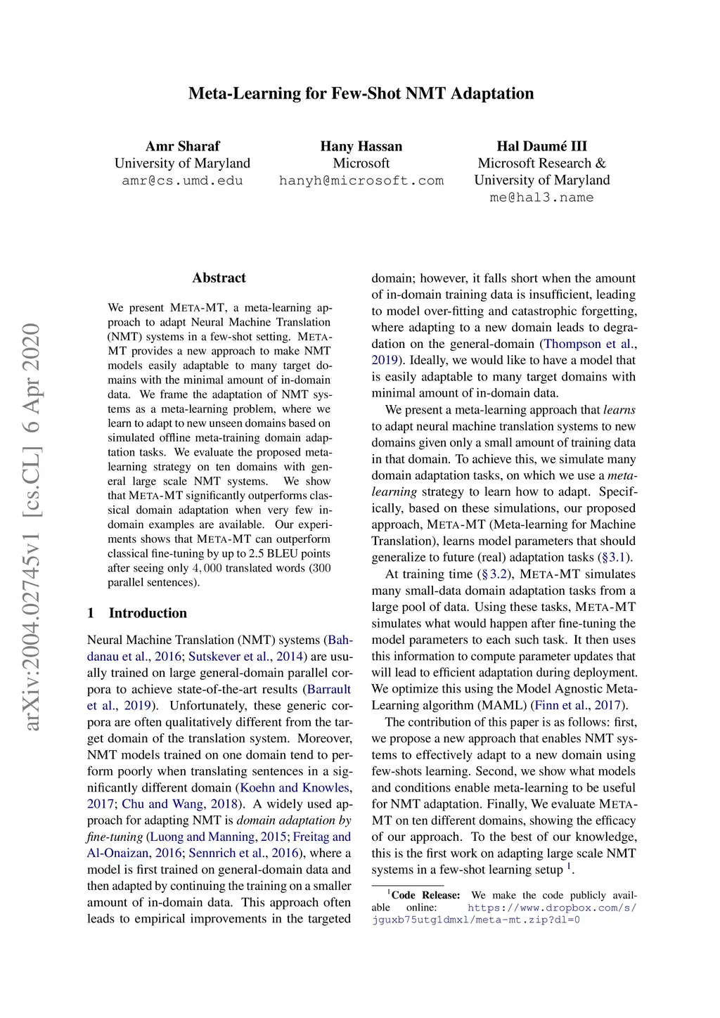 We present META-MT, a meta-learning approach to adapt Neural Machine Translation (NMT) systems in a few-shot setting. META-MT provides a new approach to make NMT models easily adaptable to many target domains with the minimal amount of in-domain data. We frame the adaptation of NMT systems as a meta-learning problem, where we learn to adapt to new unseen domains based on simulated offline meta-training domain adaptation tasks. We evaluate the proposed meta-learning strategy on ten domains with general large scale NMT systems. We show that META-MT significantly outperforms classical domain adaptation when very few in-domain examples are available. Our experiments shows that META-MT can outperform classical fine-tuning by up to 2.5 BLEU points after seeing only 4, 000 translated words (300 parallel sentences).