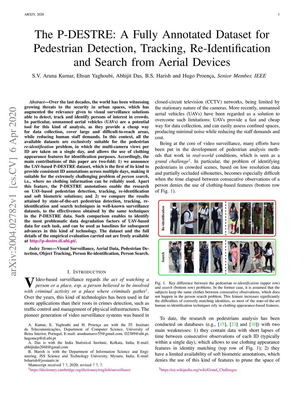 Over the last decades, the world has been witnessing growing threats to the security in urban spaces, which has augmented the relevance given to visual surveillance solutions able to detect, track and identify persons of interest in crowds. In particular, unmanned aerial vehicles (UAVs) are a potential tool for this kind of analysis, as they provide a cheap way for data collection, cover large and difficult-to-reach areas, while reducing human staff demands. In this context, all the available datasets are exclusively suitable for the pedestrian re-identification problem, in which the multi-camera views per ID are taken on a single day, and allows the use of clothing appearance features for identification purposes. Accordingly, the main contributions of this paper are two-fold: 1) we announce the UAV-based P-DESTRE dataset, which is the first of its kind to provide consistent ID annotations across multiple days, making it suitable for the extremely challenging problem of person search, i.e., where no clothing information can be reliably used. Apart this feature, the P-DESTRE annotations enable the research on UAV-based pedestrian detection, tracking, re-identification and soft biometric solutions; and 2) we compare the results attained by state-of-the-art pedestrian detection, tracking, reidentification and search techniques in well-known surveillance datasets, to the effectiveness obtained by the same techniques in the P-DESTRE data. Such comparison enables to identify the most problematic data degradation factors of UAV-based data for each task, and can be used as baselines for subsequent advances in this kind of technology. The dataset and the full details of the empirical evaluation carried out are freely available at http://p-destre.di.ubi.pt/.