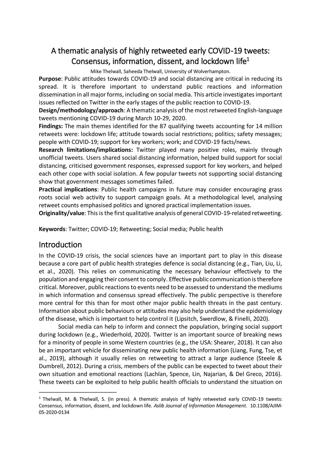 A thematic analysis of highly retweeted early COVID -19 tweets: