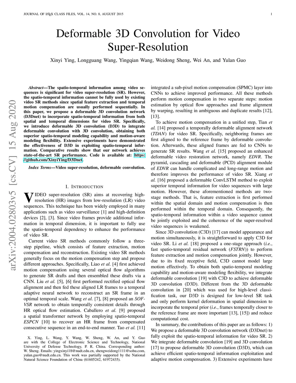 The spatio-temporal information among video sequences is significant for video super-resolution (SR). However, the spatio-temporal information cannot be fully used by existing video SR methods since spatial feature extraction and temporal motion compensation are usually performed sequentially. In this paper, we propose a deformable 3D convolution network (D3Dnet) to incorporate spatio-temporal information from both spatial and temporal dimensions for video SR. Specifically, we introduce deformable 3D convolution (D3D) to integrate deformable convolution with 3D convolution, obtaining both superior spatio-temporal modeling capability and motion-aware modeling flexibility. Extensive experiments have demonstrated the effectiveness of D3D in exploiting spatio-temporal information. Comparative results show that our network achieves state-of-the-art SR performance. Code is available at: https://github.com/XinyiYing/D3Dnet.