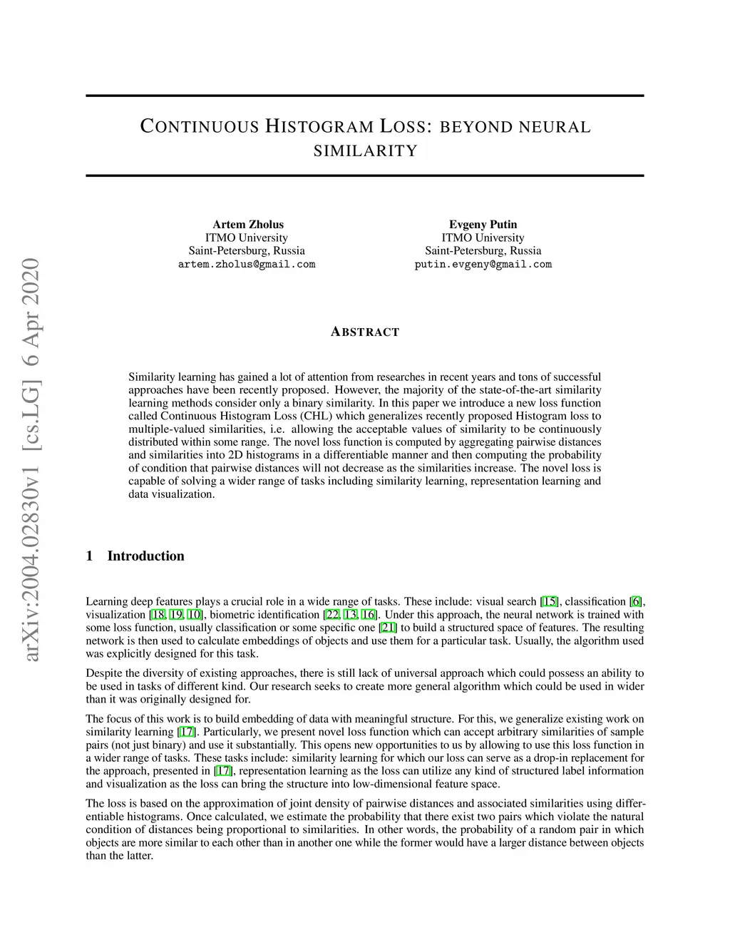 Similarity learning has gained a lot of attention from researches in recent years and tons of successful approaches have been recently proposed. However, the majority of the state-of-the-art similarity learning methods consider only a binary similarity. In this paper we introduce a new loss function called Continuous Histogram Loss (CHL) which generalizes recently proposed Histogram loss to multiple-valued similarities, i.e. allowing the acceptable values of similarity to be continuously distributed within some range. The novel loss function is computed by aggregating pairwise distances and similarities into 2D histograms in a differentiable manner and then computing the probability of condition that pairwise distances will not decrease as the similarities increase. The novel loss is capable of solving a wider range of tasks including similarity learning, representation learning and data visualization.
