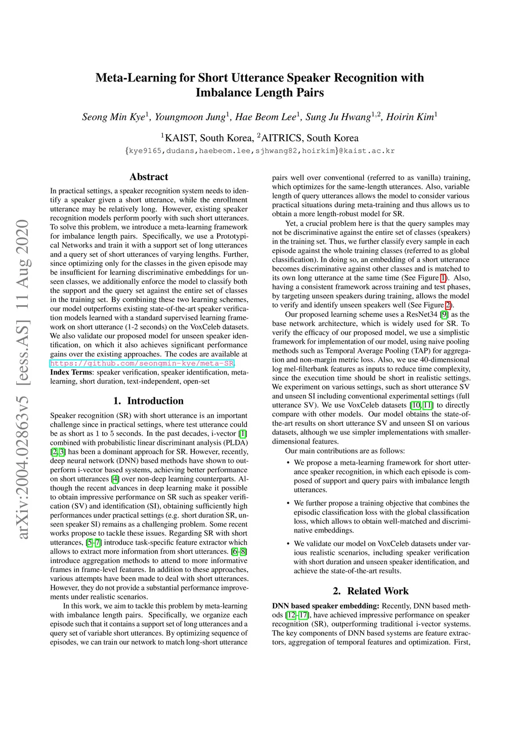 In practical settings, a speaker recognition system needs to identify a speaker given a short utterance, while the enrollment utterance may be relatively long. However, existing speaker recognition models perform poorly with such short utterances. To solve this problem, we introduce a meta-learning framework for imbalance length pairs. Specifically, we use a Prototypical Networks and train it with a support set of long utterances and a query set of short utterances of varying lengths. Further, since optimizing only for the classes in the given episode may be insufficient for learning discriminative embeddings for unseen classes, we additionally enforce the model to classify both the support and the query set against the entire set of classes in the training set. By combining these two learning schemes, our model outperforms existing state-of-the-art speaker verification models learned with a standard supervised learning framework on short utterance (1-2 seconds) on the VoxCeleb datasets. We also validate our proposed model for unseen speaker identification, on which it also achieves significant performance gains over the existing approaches. The codes are available at https://github.com/seongmin-kye/meta-SR.