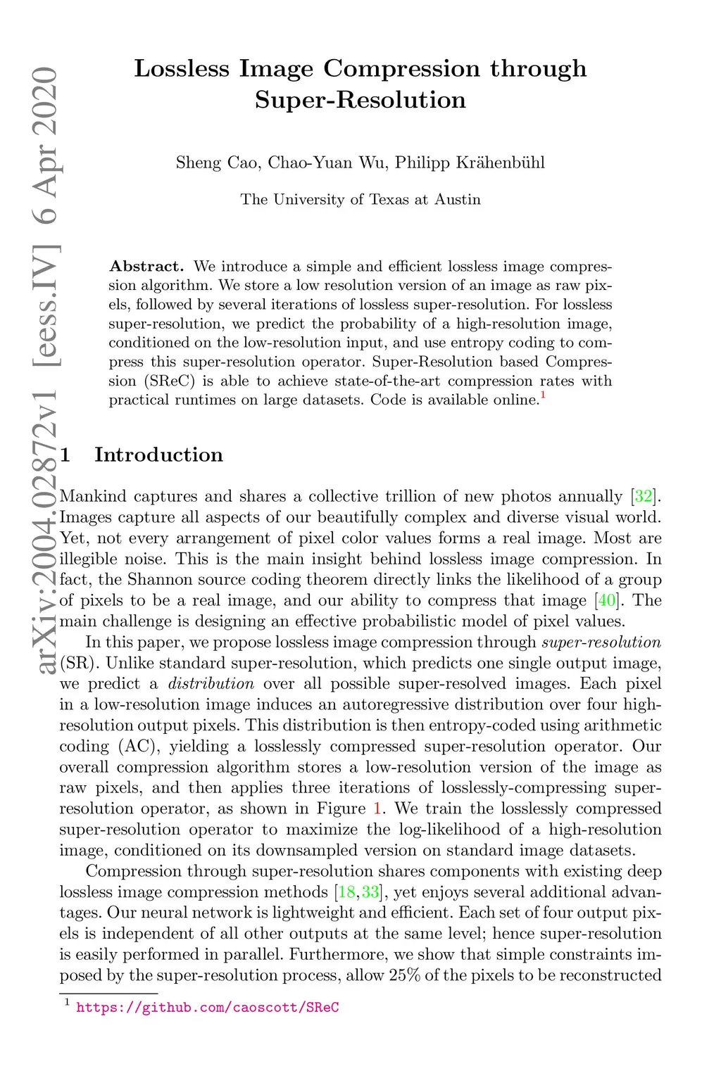 We introduce a simple and efficient lossless image compression algorithm. We store a low resolution version of an image as raw pixels, followed by several iterations of lossless super-resolution. For lossless super-resolution, we predict the probability of a high-resolution image, conditioned on the low-resolution input, and use entropy coding to compress this super-resolution operator. Super-Resolution based Compression (SReC) is able to achieve state-of-the-art compression rates with practical runtimes on large datasets. Code is available online at https://github.com/caoscott/SReC.
