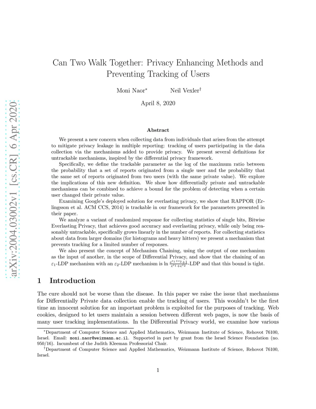 We present a new concern when collecting data from individuals that arises from the attempt to mitigate privacy leakage in multiple reporting: tracking of users participating in the data collection via the mechanisms added to provide privacy. We present several definitions for untrackable mechanisms, inspired by the differential privacy framework. Specifically, we define the trackable parameter as the log of the maximum ratio between the probability that a set of reports originated from a single user and the probability that the same set of reports originated from two users (with the same private value). We explore the implications of this new definition. We show how differentially private and untrackable mechanisms can be combined to achieve a bound for the problem of detecting when a certain user changed their private value. Examining Google's deployed solution for everlasting privacy, we show that RAPPOR (Erlingsson et al. ACM CCS, 2014) is trackable in our framework for the parameters presented in their paper. We analyze a variant of randomized response for collecting statistics of single bits, Bitwise Everlasting Privacy, that achieves good accuracy and everlasting privacy, while only being reasonably untrackable, specifically grows linearly in the number of reports. For collecting statistics about data from larger domains (for histograms and heavy hitters) we present a mechanism that prevents tracking for a limited number of responses. We also present the concept of Mechanism Chaining, using the output of one mechanism as the input of another, in the scope of Differential Privacy, and show that the chaining of an -LDP mechanism with an -LDP mechanism is -LDP and that this bound is tight.