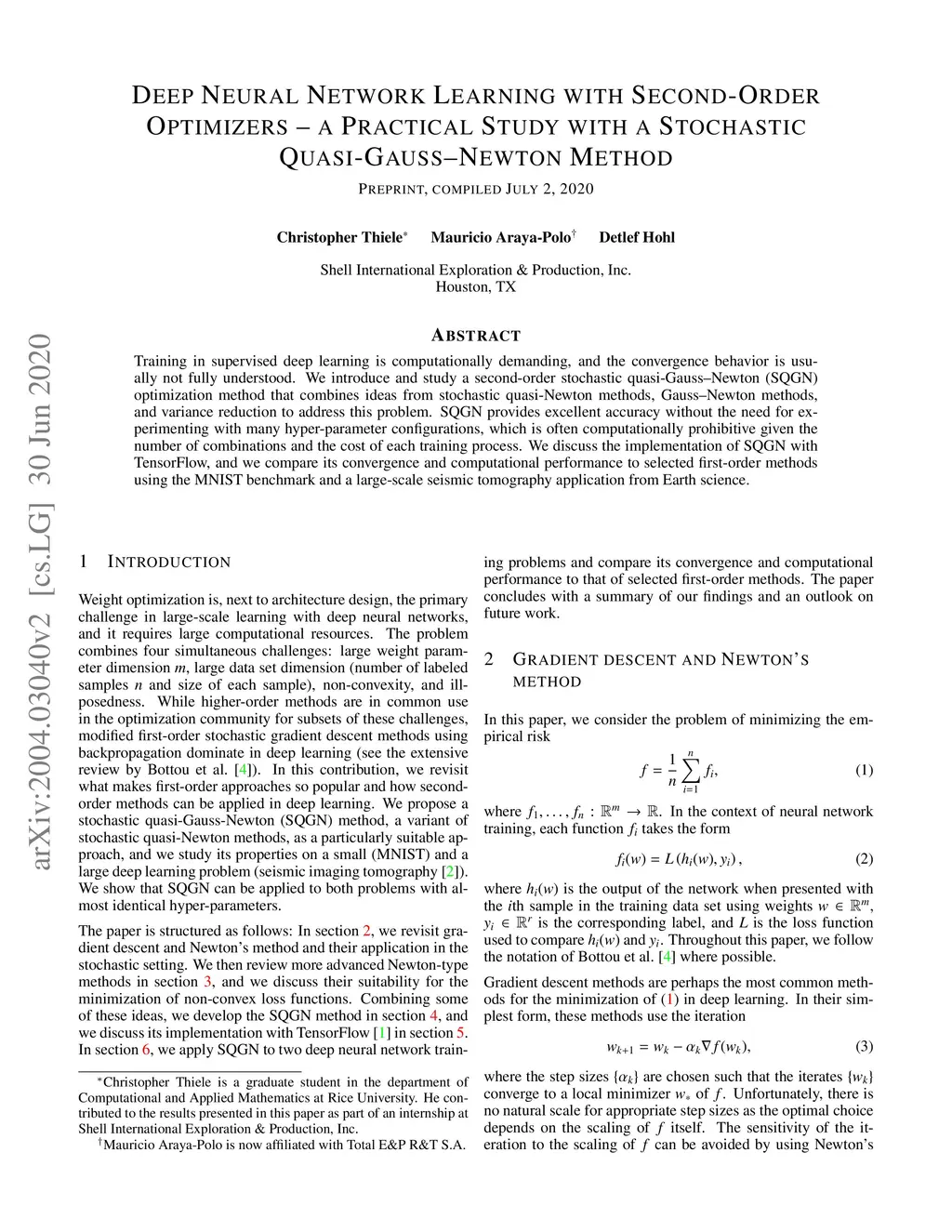 Training in supervised deep learning is computationally demanding, and the convergence behavior is usually not fully understood. We introduce and study a second-order stochastic quasi-Gauss--Newton (SQGN) optimization method that combines ideas from stochastic quasi-Newton methods, Gauss--Newton methods, and variance reduction to address this problem. SQGN provides excellent accuracy without the need for experimenting with many hyper-parameter configurations, which is often computationally prohibitive given the number of combinations and the cost of each training process. We discuss the implementation of SQGN with TensorFlow, and we compare its convergence and computational performance to selected first-order methods using the MNIST benchmark and a large-scale seismic tomography application from Earth science.