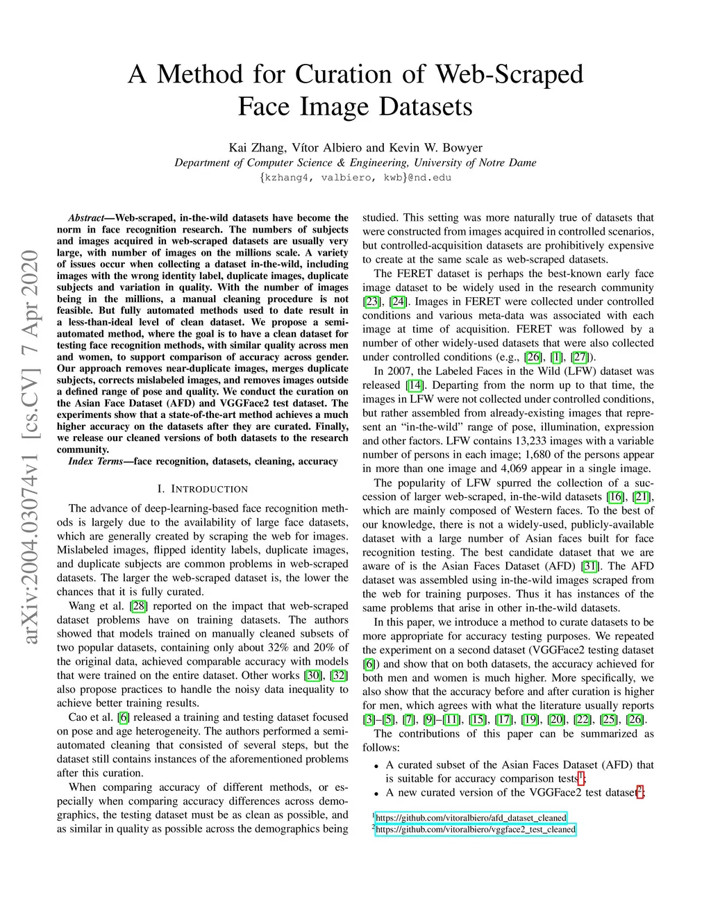 Web-scraped, in-the-wild datasets have become the norm in face recognition research. The numbers of subjects and images acquired in web-scraped datasets are usually very large, with number of images on the millions scale. A variety of issues occur when collecting a dataset in-the-wild, including images with the wrong identity label, duplicate images, duplicate subjects and variation in quality. With the number of images being in the millions, a manual cleaning procedure is not feasible. But fully automated methods used to date result in a less-than-ideal level of clean dataset. We propose a semi-automated method, where the goal is to have a clean dataset for testing face recognition methods, with similar quality across men and women, to support comparison of accuracy across gender. Our approach removes near-duplicate images, merges duplicate subjects, corrects mislabeled images, and removes images outside a defined range of pose and quality. We conduct the curation on the Asian Face Dataset (AFD) and VGGFace2 test dataset. The experiments show that a state-of-the-art method achieves a much higher accuracy on the datasets after they are curated. Finally, we release our cleaned versions of both datasets to the research community.