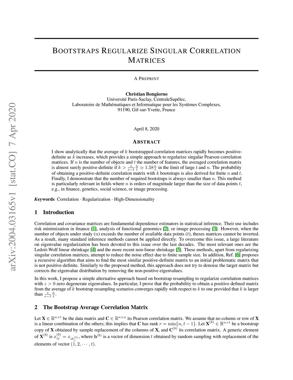 I show analytically that the average of bootstrapped correlation matrices rapidly becomes positive-definite as increases, which provides a simple approach to regularize singular Pearson correlation matrices. If is the number of objects and the number of features, the averaged correlation matrix is almost surely positive-definite if in the limit of large and . The probability of obtaining a positive-definite correlation matrix with bootstraps is also derived for finite and . Finally, I demonstrate that the number of required bootstraps is always smaller than . This method is particularly relevant in fields where is orders of magnitude larger than the size of data points , e.g., in finance, genetics, social science, or image processing.