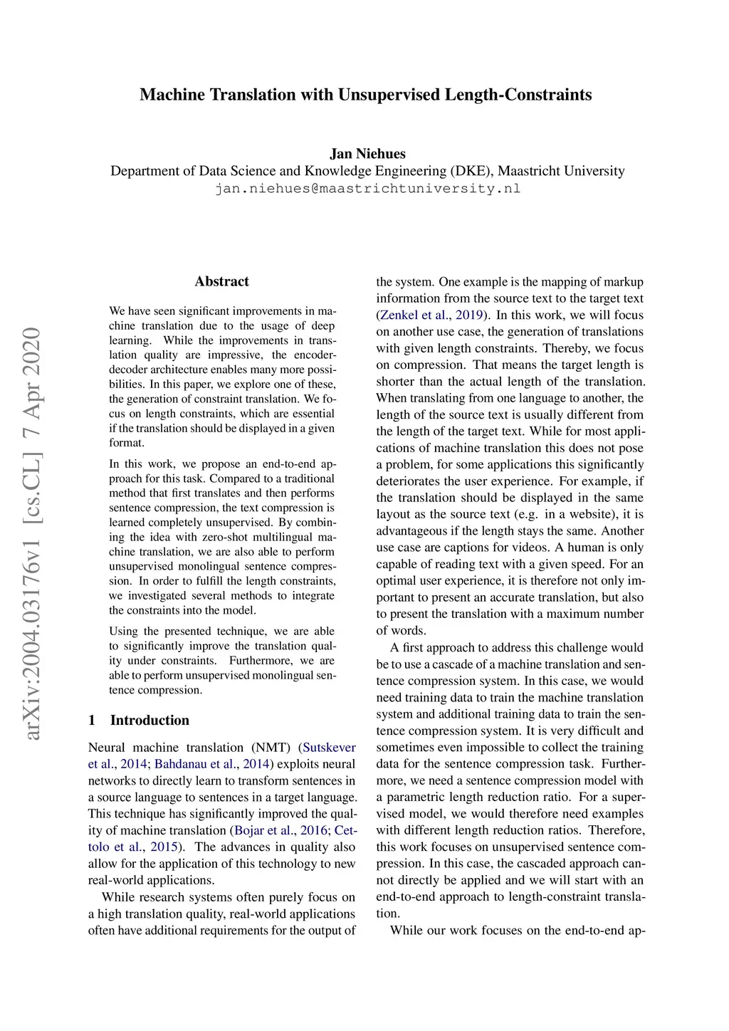 We have seen significant improvements in machine translation due to the usage of deep learning. While the improvements in translation quality are impressive, the encoder-decoder architecture enables many more possibilities. In this paper, we explore one of these, the generation of constraint translation. We focus on length constraints, which are essential if the translation should be displayed in a given format. In this work, we propose an end-to-end approach for this task. Compared to a traditional method that first translates and then performs sentence compression, the text compression is learned completely unsupervised. By combining the idea with zero-shot multilingual machine translation, we are also able to perform unsupervised monolingual sentence compression. In order to fulfill the length constraints, we investigated several methods to integrate the constraints into the model. Using the presented technique, we are able to significantly improve the translation quality under constraints. Furthermore, we are able to perform unsupervised monolingual sentence compression.