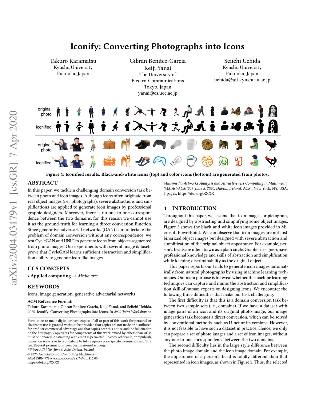 In this paper, we tackle a challenging domain conversion task between photo and icon images. Although icons often originate from real object images (i.e., photographs), severe abstractions and simplifications are applied to generate icon images by professional graphic designers. Moreover, there is no one-to-one correspondence between the two domains, for this reason we cannot use it as the ground-truth for learning a direct conversion function. Since generative adversarial networks (GAN) can undertake the problem of domain conversion without any correspondence, we test CycleGAN and UNIT to generate icons from objects segmented from photo images. Our experiments with several image datasets prove that CycleGAN learns sufficient abstraction and simplification ability to generate icon-like images.