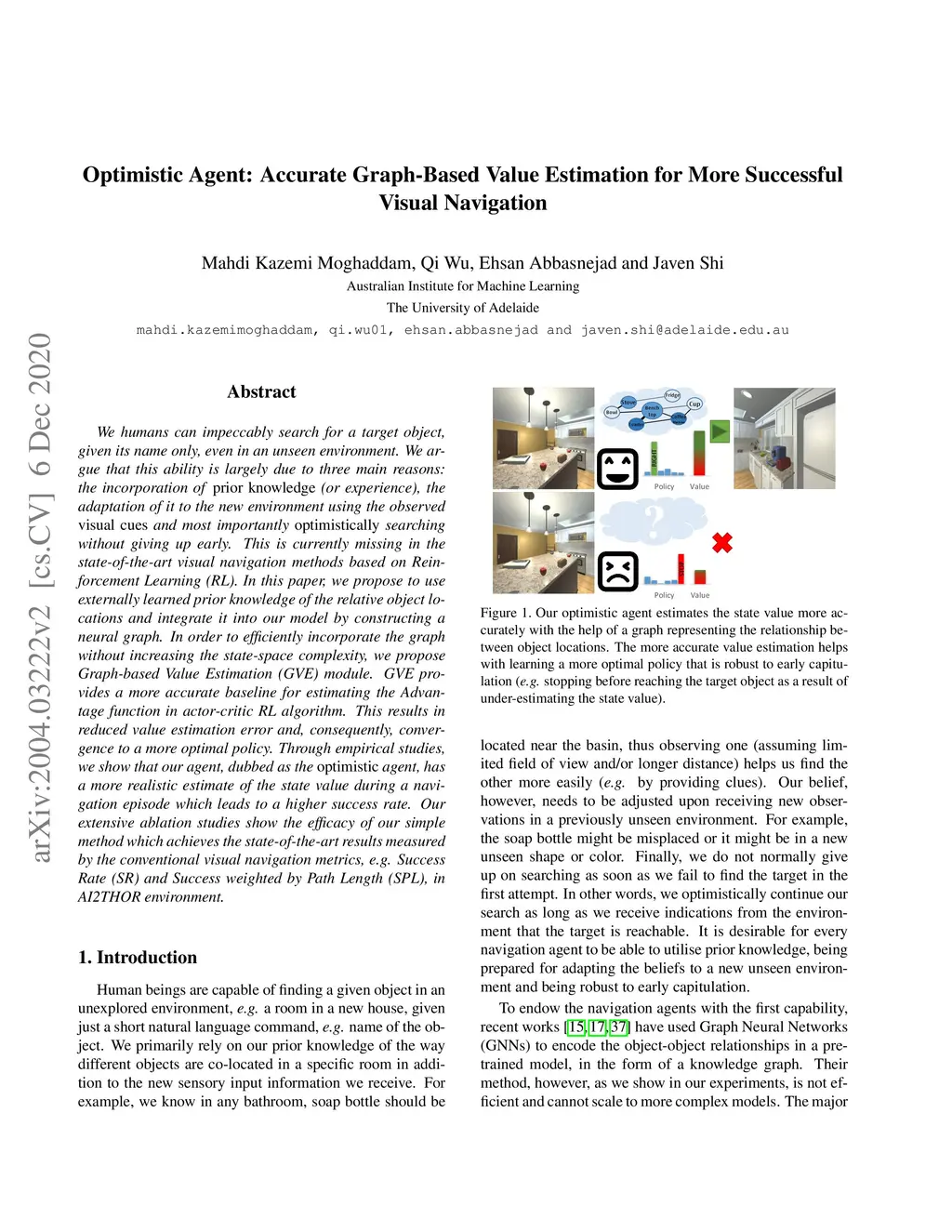 We humans can impeccably search for a target object, given its name only, even in an unseen environment. We argue that this ability is largely due to three main reasons: the incorporation of prior knowledge (or experience), the adaptation of it to the new environment using the observed visual cues and most importantly optimistically searching without giving up early. This is currently missing in the state-of-the-art visual navigation methods based on Reinforcement Learning (RL). In this paper, we propose to use externally learned prior knowledge of the relative object locations and integrate it into our model by constructing a neural graph. In order to efficiently incorporate the graph without increasing the state-space complexity, we propose our Graph-based Value Estimation (GVE) module. GVE provides a more accurate baseline for estimating the Advantage function in actor-critic RL algorithm. This results in reduced value estimation error and, consequently, convergence to a more optimal policy. Through empirical studies, we show that our agent, dubbed as the optimistic agent, has a more realistic estimate of the state value during a navigation episode which leads to a higher success rate. Our extensive ablation studies show the efficacy of our simple method which achieves the state-of-the-art results measured by the conventional visual navigation metrics, e.g. Success Rate (SR) and Success weighted by Path Length (SPL), in AI2THOR environment.