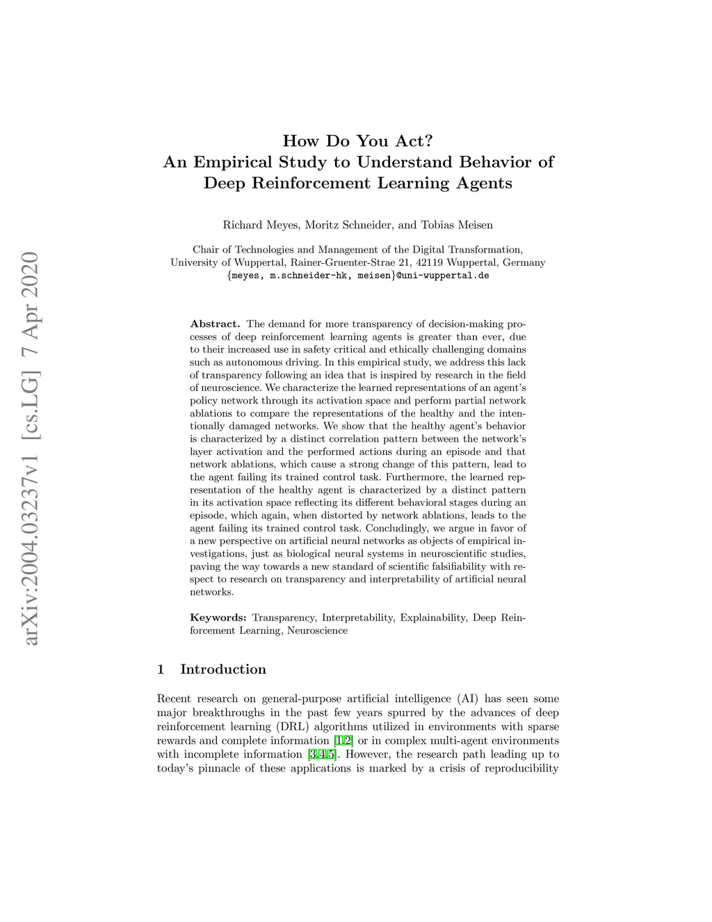 The demand for more transparency of decision-making processes of deep reinforcement learning agents is greater than ever, due to their increased use in safety critical and ethically challenging domains such as autonomous driving. In this empirical study, we address this lack of transparency following an idea that is inspired by research in the field of neuroscience. We characterize the learned representations of an agent's policy network through its activation space and perform partial network ablations to compare the representations of the healthy and the intentionally damaged networks. We show that the healthy agent's behavior is characterized by a distinct correlation pattern between the network's layer activation and the performed actions during an episode and that network ablations, which cause a strong change of this pattern, lead to the agent failing its trained control task. Furthermore, the learned representation of the healthy agent is characterized by a distinct pattern in its activation space reflecting its different behavioral stages during an episode, which again, when distorted by network ablations, leads to the agent failing its trained control task. Concludingly, we argue in favor of a new perspective on artificial neural networks as objects of empirical investigations, just as biological neural systems in neuroscientific studies, paving the way towards a new standard of scientific falsifiability with respect to research on transparency and interpretability of artificial neural networks.