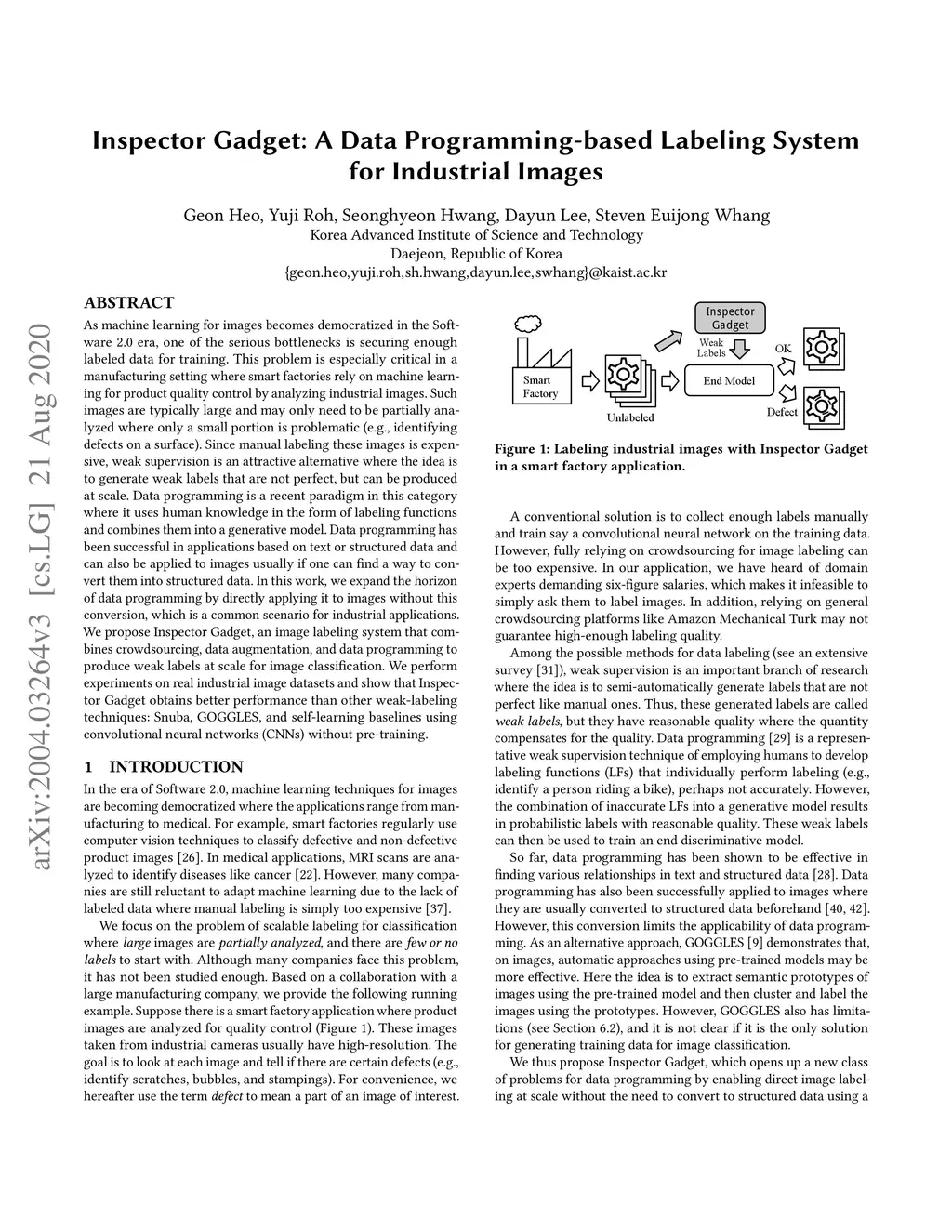 As machine learning for images becomes democratized in the Software 2.0 era, one of the serious bottlenecks is securing enough labeled data for training. This problem is especially critical in a manufacturing setting where smart factories rely on machine learning for product quality control by analyzing industrial images. Such images are typically large and may only need to be partially analyzed where only a small portion is problematic (e.g., identifying defects on a surface). Since manual labeling these images is expensive, weak supervision is an attractive alternative where the idea is to generate weak labels that are not perfect, but can be produced at scale. Data programming is a recent paradigm in this category where it uses human knowledge in the form of labeling functions and combines them into a generative model. Data programming has been successful in applications based on text or structured data and can also be applied to images usually if one can find a way to convert them into structured data. In this work, we expand the horizon of data programming by directly applying it to images without this conversion, which is a common scenario for industrial applications. We propose Inspector Gadget, an image labeling system that combines crowdsourcing, data augmentation, and data programming to produce weak labels at scale for image classification. We perform experiments on real industrial image datasets and show that Inspector Gadget obtains better performance than other weak-labeling techniques: Snuba, GOGGLES, and self-learning baselines using convolutional neural networks (CNNs) without pre-training.