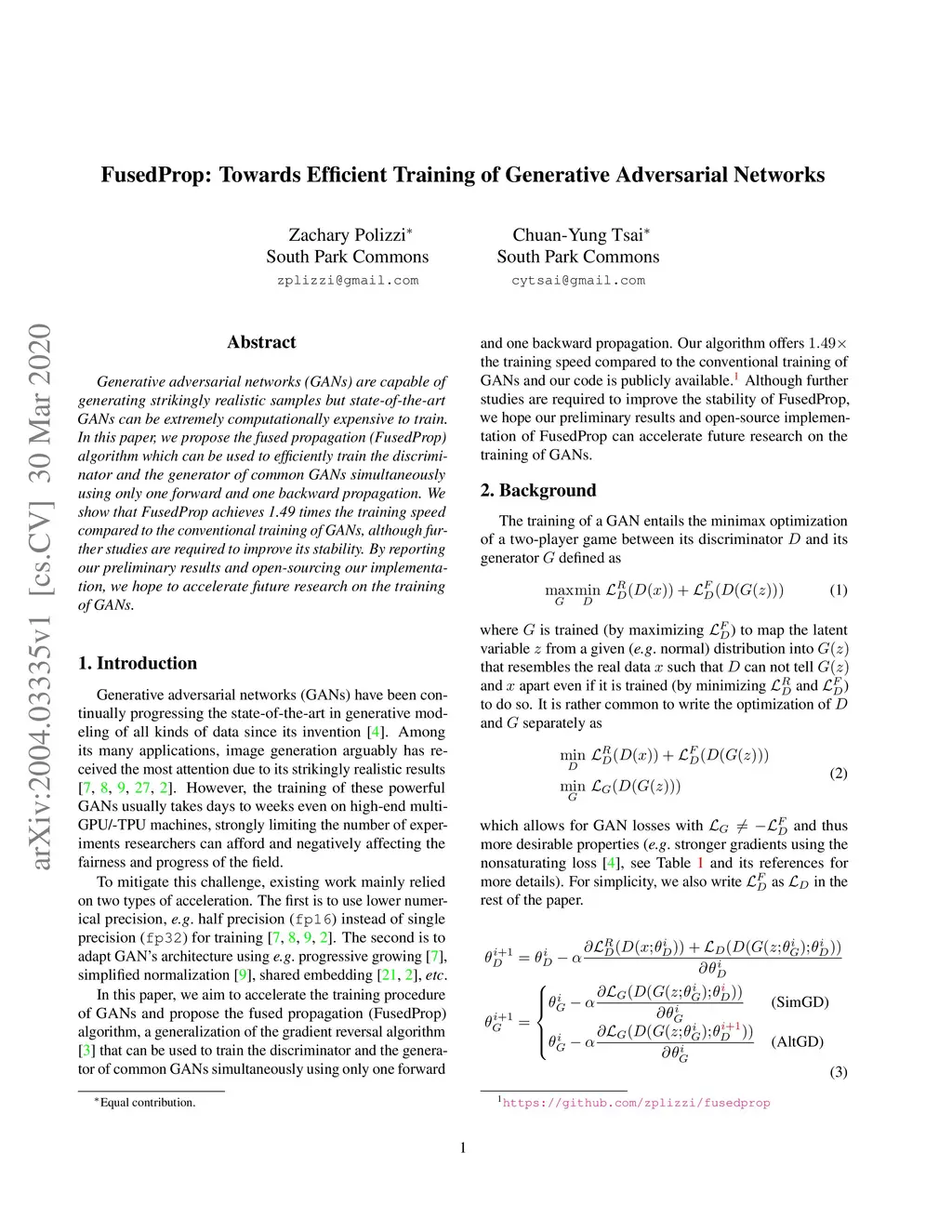 Generative adversarial networks (GANs) are capable of generating strikingly realistic samples but state-of-the-art GANs can be extremely computationally expensive to train. In this paper, we propose the fused propagation (FusedProp) algorithm which can be used to efficiently train the discriminator and the generator of common GANs simultaneously using only one forward and one backward propagation. We show that FusedProp achieves 1.49 times the training speed compared to the conventional training of GANs, although further studies are required to improve its stability. By reporting our preliminary results and open-sourcing our implementation, we hope to accelerate future research on the training of GANs.