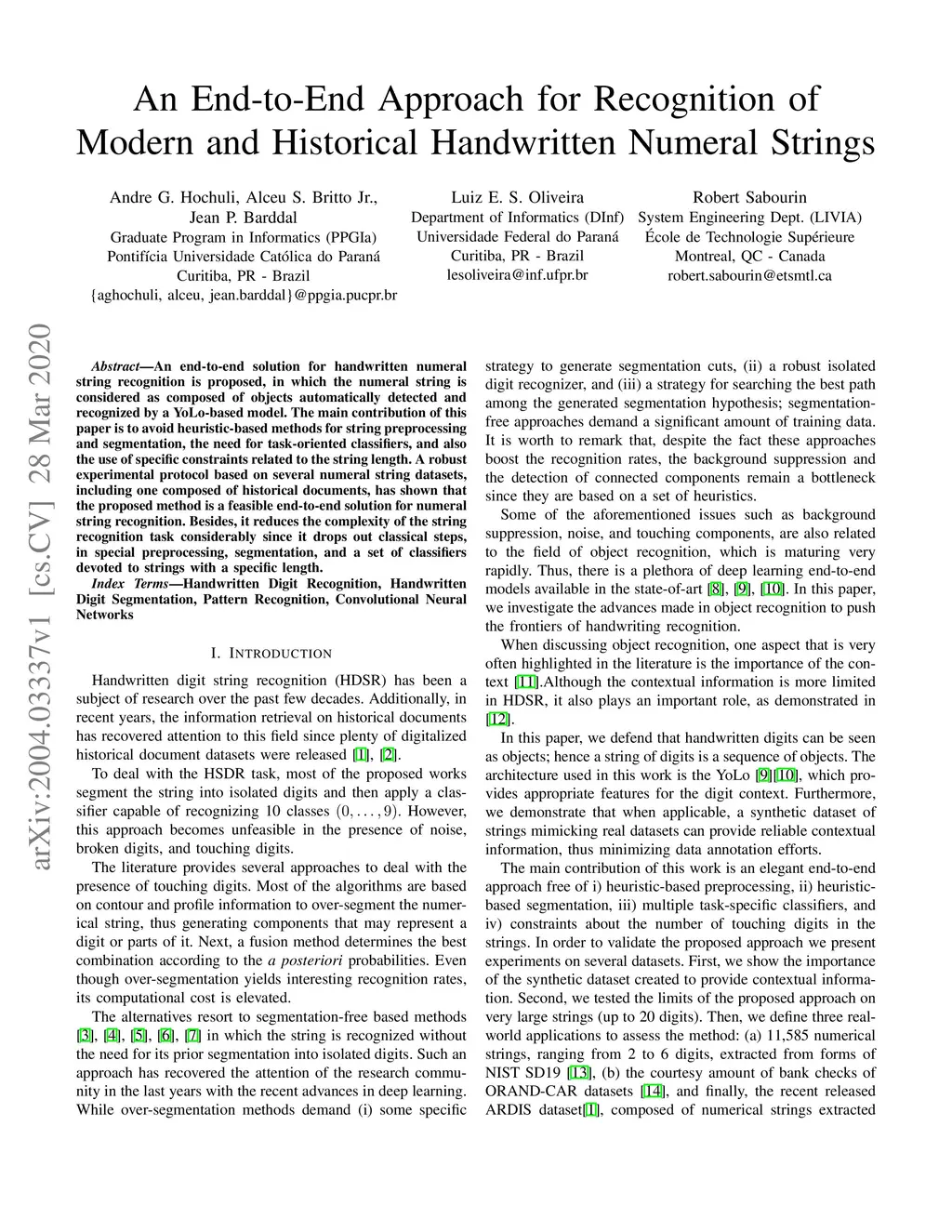 An end-to-end solution for handwritten numeral string recognition is proposed, in which the numeral string is considered as composed of objects automatically detected and recognized by a YoLo-based model. The main contribution of this paper is to avoid heuristic-based methods for string preprocessing and segmentation, the need for task-oriented classifiers, and also the use of specific constraints related to the string length. A robust experimental protocol based on several numeral string datasets, including one composed of historical documents, has shown that the proposed method is a feasible end-to-end solution for numeral string recognition. Besides, it reduces the complexity of the string recognition task considerably since it drops out classical steps, in special preprocessing, segmentation, and a set of classifiers devoted to strings with a specific length.
