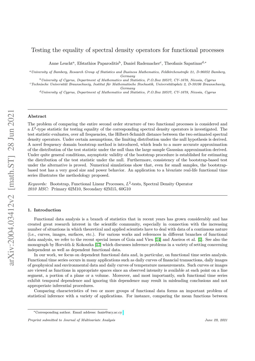 The problem of comparing the entire second order structure of two functional processes is considered and a -type statistic for testing equality of the corresponding spectral density operators is investigated. The test statistic evaluates, over all frequencies, the Hilbert-Schmidt distance between the two estimated spectral density operators. Under certain assumptions, the limiting distribution under the null hypothesis is derived. A novel frequency domain bootstrap method is introduced, which leads to a more accurate approximation of the distribution of the test statistic under the null than the large sample Gaussian approximation derived. Under quite general conditions, asymptotic validity of the bootstrap procedure is established for estimating the distribution of the test statistic under the null. Furthermore, consistency of the bootstrap-based test under the alternative is proved. Numerical simulations show that, even for small samples, the bootstrap-based test has a very good size and power behavior. An application to a bivariate real-life functional time series illustrates the methodology proposed.
