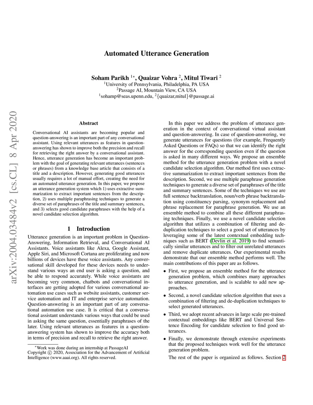 Conversational AI assistants are becoming popular and question-answering is an important part of any conversational assistant. Using relevant utterances as features in question-answering has shown to improve both the precision and recall for retrieving the right answer by a conversational assistant. Hence, utterance generation has become an important problem with the goal of generating relevant utterances (sentences or phrases) from a knowledge base article that consists of a title and a description. However, generating good utterances usually requires a lot of manual effort, creating the need for an automated utterance generation. In this paper, we propose an utterance generation system which 1) uses extractive summarization to extract important sentences from the description, 2) uses multiple paraphrasing techniques to generate a diverse set of paraphrases of the title and summary sentences, and 3) selects good candidate paraphrases with the help of a novel candidate selection algorithm.