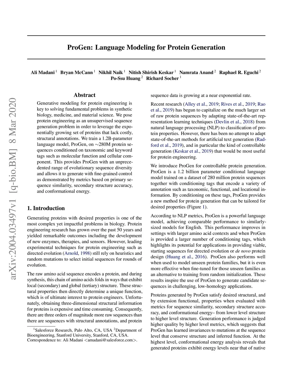 Generative modeling for protein engineering is key to solving fundamental problems in synthetic biology, medicine, and material science. We pose protein engineering as an unsupervised sequence generation problem in order to leverage the exponentially growing set of proteins that lack costly, structural annotations. We train a 1.2B-parameter language model, ProGen, on ~280M protein sequences conditioned on taxonomic and keyword tags such as molecular function and cellular component. This provides ProGen with an unprecedented range of evolutionary sequence diversity and allows it to generate with fine-grained control as demonstrated by metrics based on primary sequence similarity, secondary structure accuracy, and conformational energy.