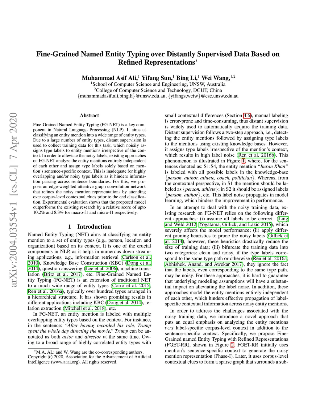 Fine-Grained Named Entity Typing (FG-NET) is a key component in Natural Language Processing (NLP). It aims at classifying an entity mention into a wide range of entity types. Due to a large number of entity types, distant supervision is used to collect training data for this task, which noisily assigns type labels to entity mentions irrespective of the context. In order to alleviate the noisy labels, existing approaches on FGNET analyze the entity mentions entirely independent of each other and assign type labels solely based on mention sentence-specific context. This is inadequate for highly overlapping and noisy type labels as it hinders information passing across sentence boundaries. For this, we propose an edge-weighted attentive graph convolution network that refines the noisy mention representations by attending over corpus-level contextual clues prior to the end classification. Experimental evaluation shows that the proposed model outperforms the existing research by a relative score of upto 10.2% and 8.3% for macro f1 and micro f1 respectively.