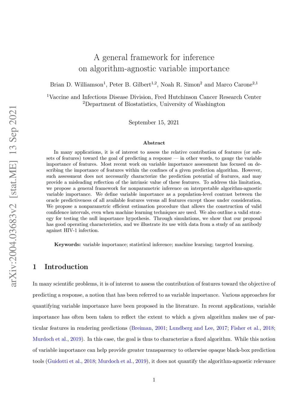 In many applications, it is of interest to assess the relative contribution of features (or subsets of features) toward the goal of predicting a response -- in other words, to gauge the variable importance of features. Most recent work on variable importance assessment has focused on describing the importance of features within the confines of a given prediction algorithm. However, such assessment does not necessarily characterize the prediction potential of features, and may provide a misleading reflection of the intrinsic value of these features. To address this limitation, we propose a general framework for nonparametric inference on interpretable algorithm-agnostic variable importance. We define variable importance as a population-level contrast between the oracle predictiveness of all available features versus all features except those under consideration. We propose a nonparametric efficient estimation procedure that allows the construction of valid confidence intervals, even when machine learning techniques are used. We also outline a valid strategy for testing the null importance hypothesis. Through simulations, we show that our proposal has good operating characteristics, and we illustrate its use with data from a study of an antibody against HIV-1 infection.
