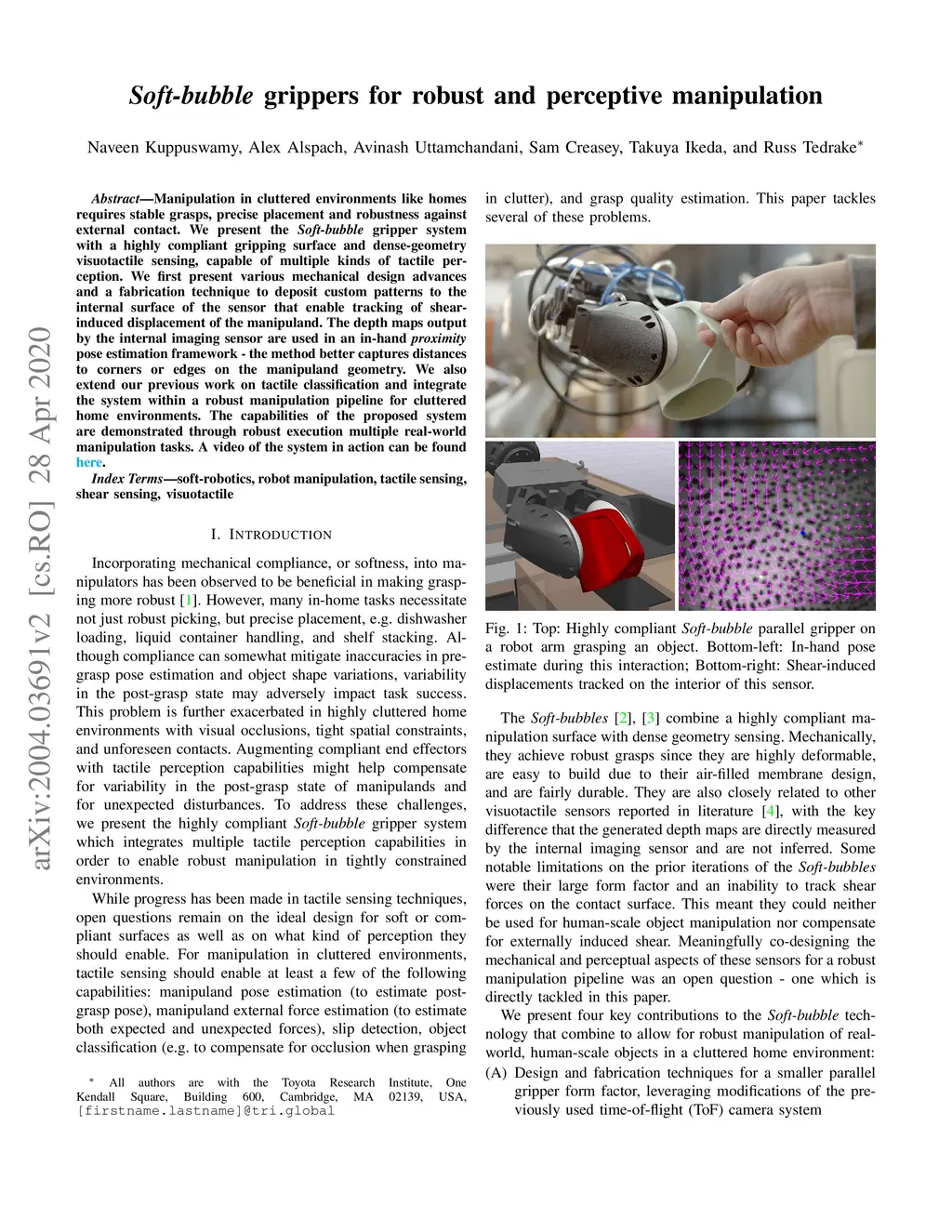 Manipulation in cluttered environments like homes requires stable grasps, precise placement and robustness against external contact. We present the Soft-Bubble gripper system with a highly compliant gripping surface and dense-geometry visuotactile sensing, capable of multiple kinds of tactile perception. We first present various mechanical design advances and a fabrication technique to deposit custom patterns to the internal surface of the sensor that enable tracking of shear-induced displacement of the manipuland. The depth maps output by the internal imaging sensor are used in an in-hand proximity pose estimation framework -- the method better captures distances to corners or edges on the manipuland geometry. We also extend our previous work on tactile classification and integrate the system within a robust manipulation pipeline for cluttered home environments. The capabilities of the proposed system are demonstrated through robust execution multiple real-world manipulation tasks. A video of the system in action can be found here: [https://youtu.be/G_wBsbQyBfc].