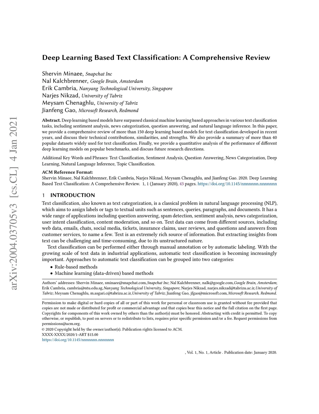 Deep learning based models have surpassed classical machine learning based approaches in various text classification tasks, including sentiment analysis, news categorization, question answering, and natural language inference. In this paper, we provide a comprehensive review of more than 150 deep learning based models for text classification developed in recent years, and discuss their technical contributions, similarities, and strengths. We also provide a summary of more than 40 popular datasets widely used for text classification. Finally, we provide a quantitative analysis of the performance of different deep learning models on popular benchmarks, and discuss future research directions.