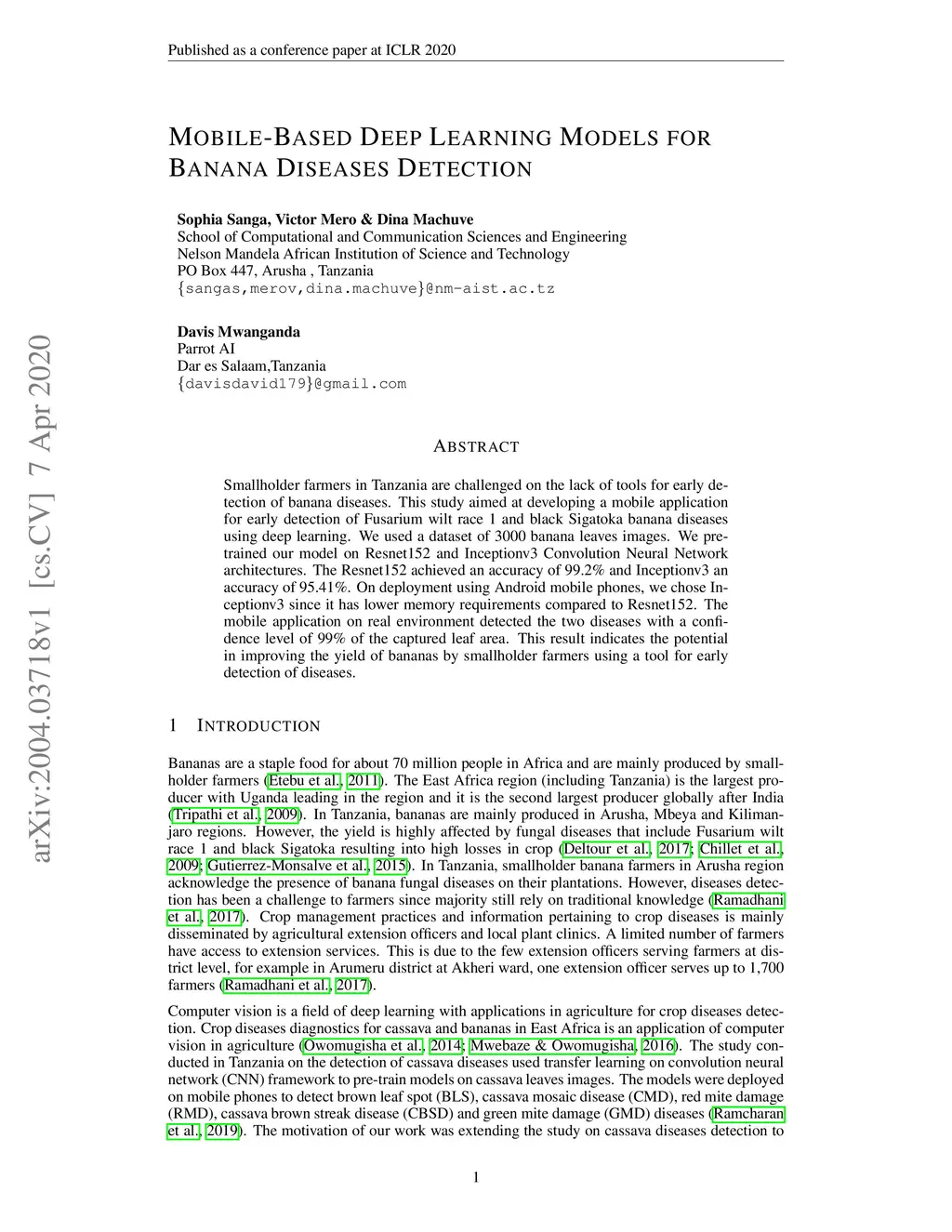 Mobile-Based Deep Learning Models for Banana Diseases Detection