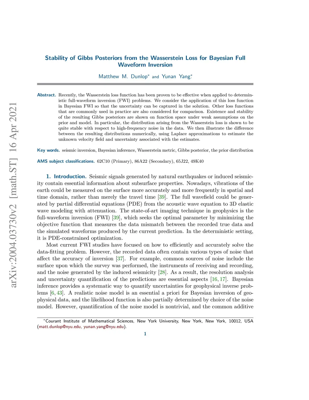 Recently, the Wasserstein loss function has been proven to be effective when applied to deterministic full-waveform inversion (FWI) problems. We consider the application of this loss function in Bayesian FWI so that the uncertainty can be captured in the solution. Other loss functions that are commonly used in practice are also considered for comparison. Existence and stability of the resulting Gibbs posteriors are shown on function space under weak assumptions on the prior and model. In particular, the distribution arising from the Wasserstein loss is shown to be quite stable with respect to high-frequency noise in the data. We then illustrate the difference between the resulting distributions numerically, using Laplace approximations to estimate the unknown velocity field and uncertainty associated with the estimates.