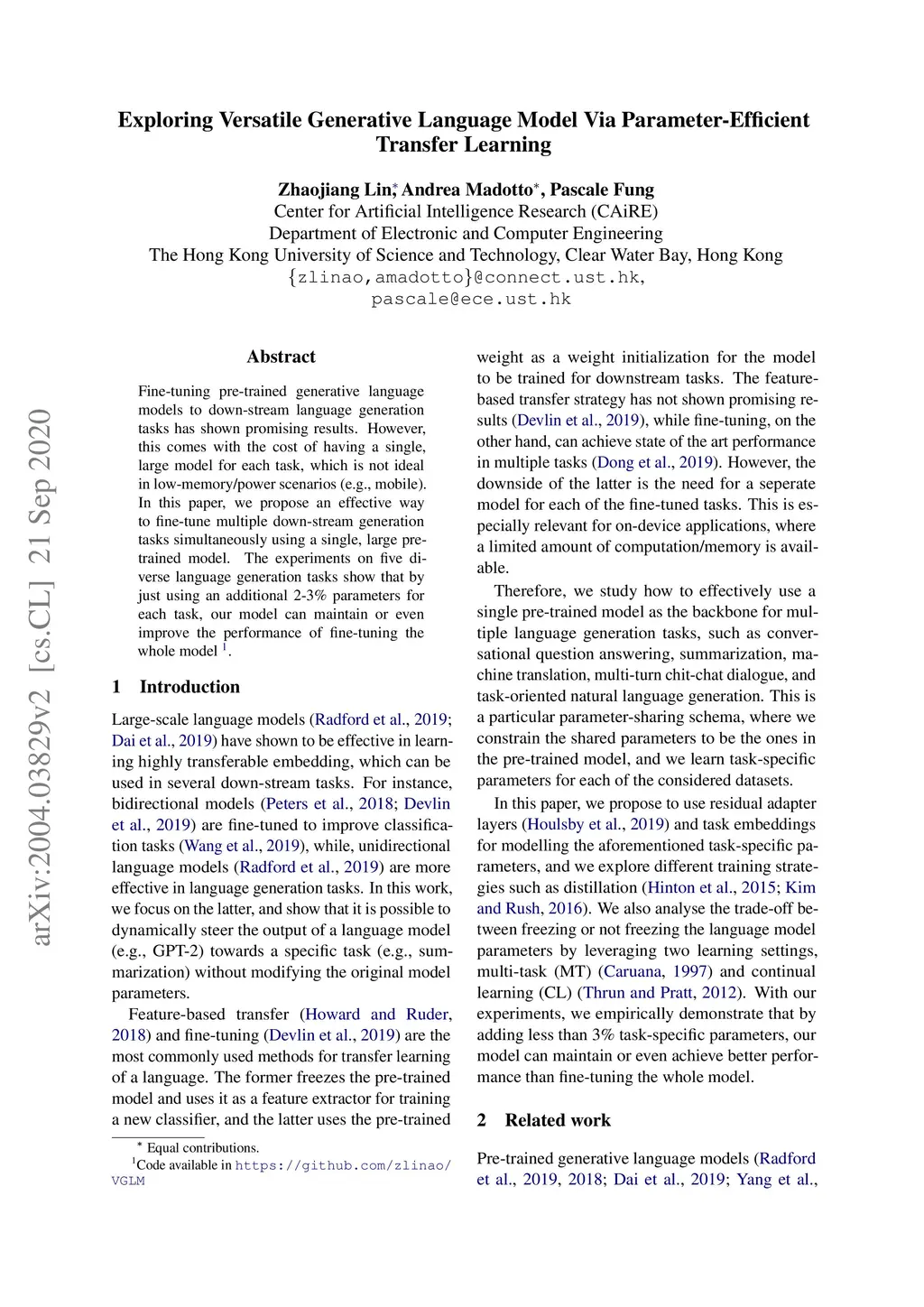 Fine-tuning pre-trained generative language models to down-stream language generation tasks has shown promising results. However, this comes with the cost of having a single, large model for each task, which is not ideal in low-memory/power scenarios (e.g., mobile). In this paper, we propose an effective way to fine-tune multiple down-stream generation tasks simultaneously using a single, large pre-trained model. The experiments on five diverse language generation tasks show that by just using an additional 2-3% parameters for each task, our model can maintain or even improve the performance of fine-tuning the whole model.
