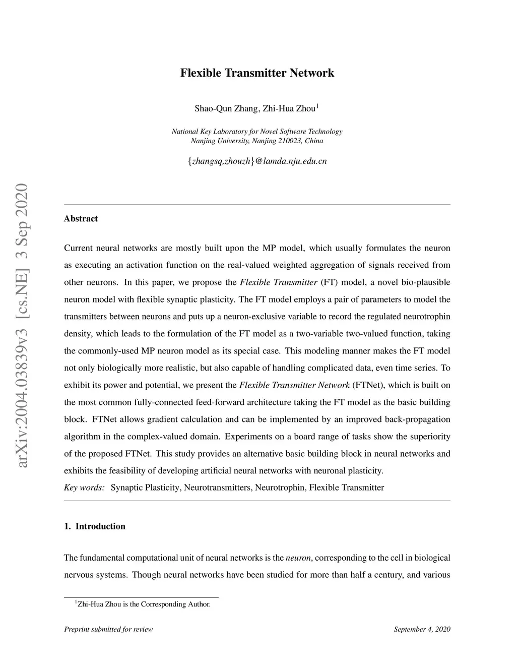 Current neural networks are mostly built upon the MP model, which usually formulates the neuron as executing an activation function on the real-valued weighted aggregation of signals received from other neurons. In this paper, we propose the Flexible Transmitter (FT) model, a novel bio-plausible neuron model with flexible synaptic plasticity. The FT model employs a pair of parameters to model the transmitters between neurons and puts up a neuron-exclusive variable to record the regulated neurotrophin density, which leads to the formulation of the FT model as a two-variable two-valued function, taking the commonly-used MP neuron model as its special case. This modeling manner makes the FT model not only biologically more realistic, but also capable of handling complicated data, even time series. To exhibit its power and potential, we present the Flexible Transmitter Network (FTNet), which is built on the most common fully-connected feed-forward architecture taking the FT model as the basic building block. FTNet allows gradient calculation and can be implemented by an improved back-propagation algorithm in the complex-valued domain. Experiments on a board range of tasks show the superiority of the proposed FTNet. This study provides an alternative basic building block in neural networks and exhibits the feasibility of developing artificial neural networks with neuronal plasticity.
