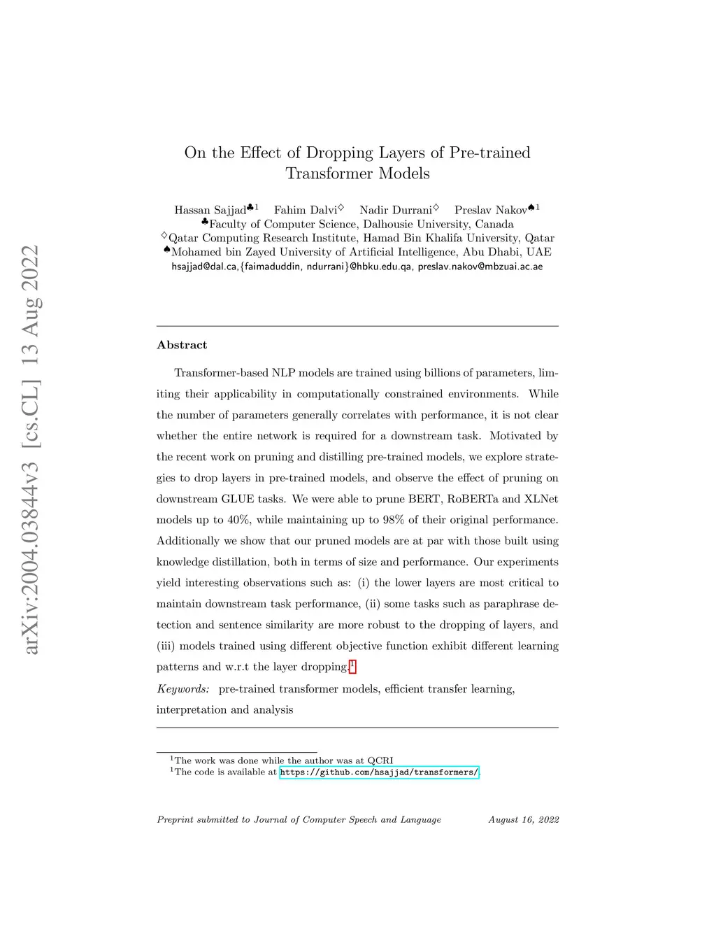 Transformer-based NLP models are trained using hundreds of millions or even billions of parameters, limiting their applicability in computationally constrained environments. While the number of parameters generally correlates with performance, it is not clear whether the entire network is required for a downstream task. Motivated by the recent work on pruning and distilling pre-trained models, we explore strategies to drop layers in pre-trained models, and observe the effect of pruning on downstream GLUE tasks. We were able to prune BERT, RoBERTa and XLNet models up to 40%, while maintaining up to 98% of their original performance. Additionally we show that our pruned models are on par with those built using knowledge distillation, both in terms of size and performance. Our experiments yield interesting observations such as, (i) the lower layers are most critical to maintain downstream task performance, (ii) some tasks such as paraphrase detection and sentence similarity are more robust to the dropping of layers, and (iii) models trained using a different objective function exhibit different learning patterns and w.r.t the layer dropping.