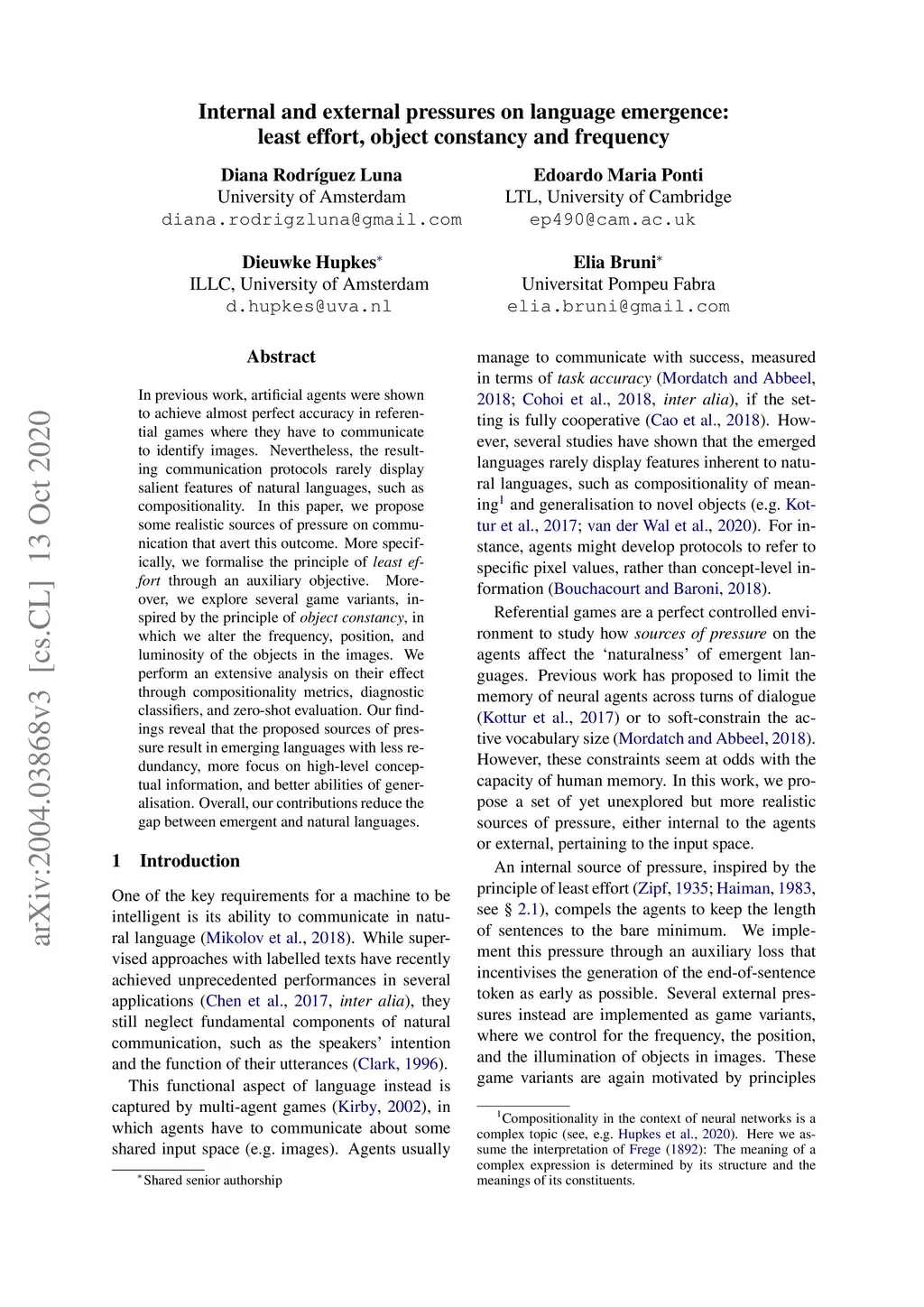 In previous work, artificial agents were shown to achieve almost perfect accuracy in referential games where they have to communicate to identify images. Nevertheless, the resulting communication protocols rarely display salient features of natural languages, such as compositionality. In this paper, we propose some realistic sources of pressure on communication that avert this outcome. More specifically, we formalise the principle of least effort through an auxiliary objective. Moreover, we explore several game variants, inspired by the principle of object constancy, in which we alter the frequency, position, and luminosity of the objects in the images. We perform an extensive analysis on their effect through compositionality metrics, diagnostic classifiers, and zero-shot evaluation. Our findings reveal that the proposed sources of pressure result in emerging languages with less redundancy, more focus on high-level conceptual information, and better abilities of generalisation. Overall, our contributions reduce the gap between emergent and natural languages.