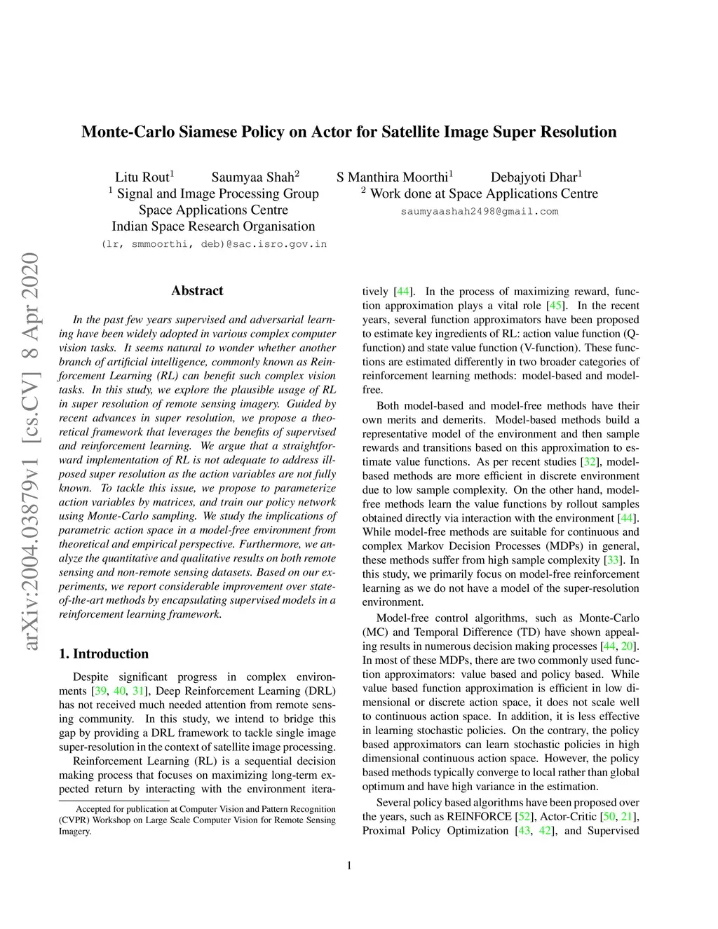 Monte-Carlo Siamese Policy on Actor for Satellite Image Super Resolution