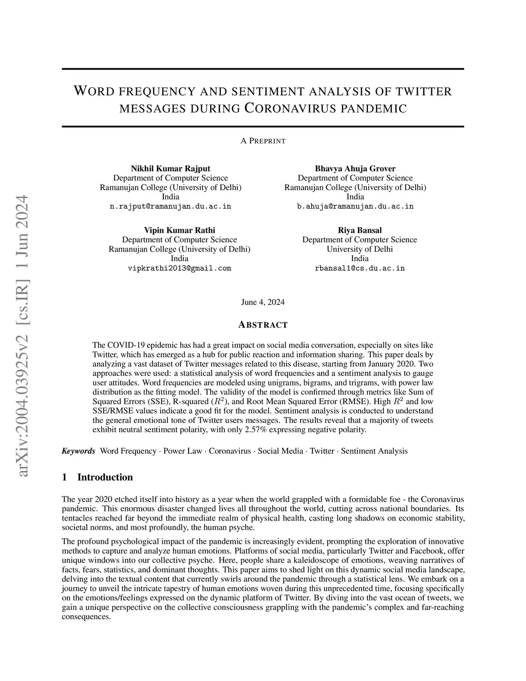 The COVID-19 epidemic has had a great impact on social media conversation, especially on sites like Twitter, which has emerged as a hub for public reaction and information sharing. This paper deals by analyzing a vast dataset of Twitter messages related to this disease, starting from January 2020. Two approaches were used: a statistical analysis of word frequencies and a sentiment analysis to gauge user attitudes. Word frequencies are modeled using unigrams, bigrams, and trigrams, with power law distribution as the fitting model. The validity of the model is confirmed through metrics like Sum of Squared Errors (SSE), R-squared (), and Root Mean Squared Error (RMSE). High and low SSE/RMSE values indicate a good fit for the model. Sentiment analysis is conducted to understand the general emotional tone of Twitter users messages. The results reveal that a majority of tweets exhibit neutral sentiment polarity, with only 2.57\% expressing negative polarity.